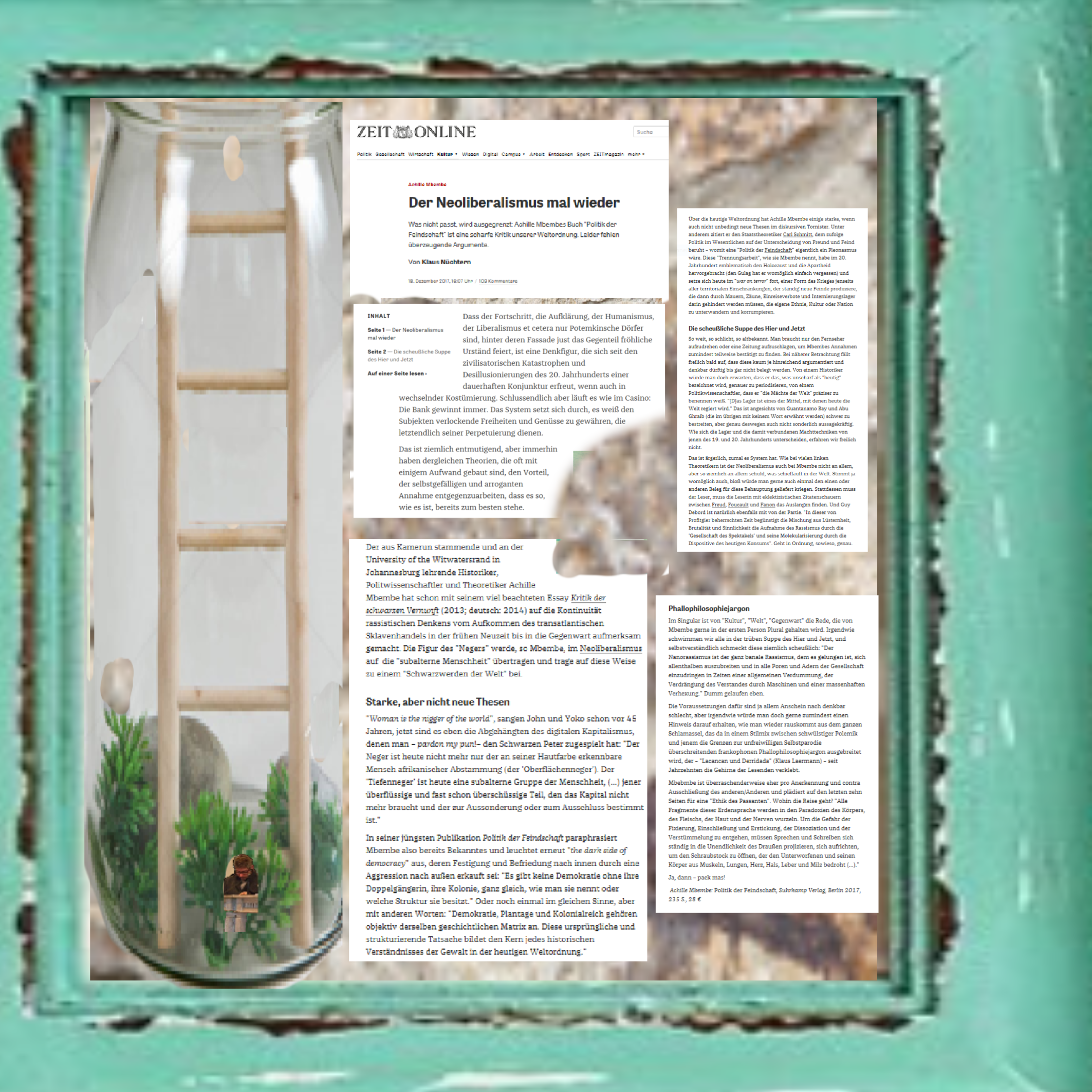 Es könnte noch einiges angeführt werden, einiges aus der nüchternen Betrachtung zitiert werden, damit kein Mensch das sich antun muß, die gesamte Rezension zu lesen, aber das nächste Buch von Mbembe liegt schon griffbereit, um es von der ersten bis zur letzten Seite zu lesen.