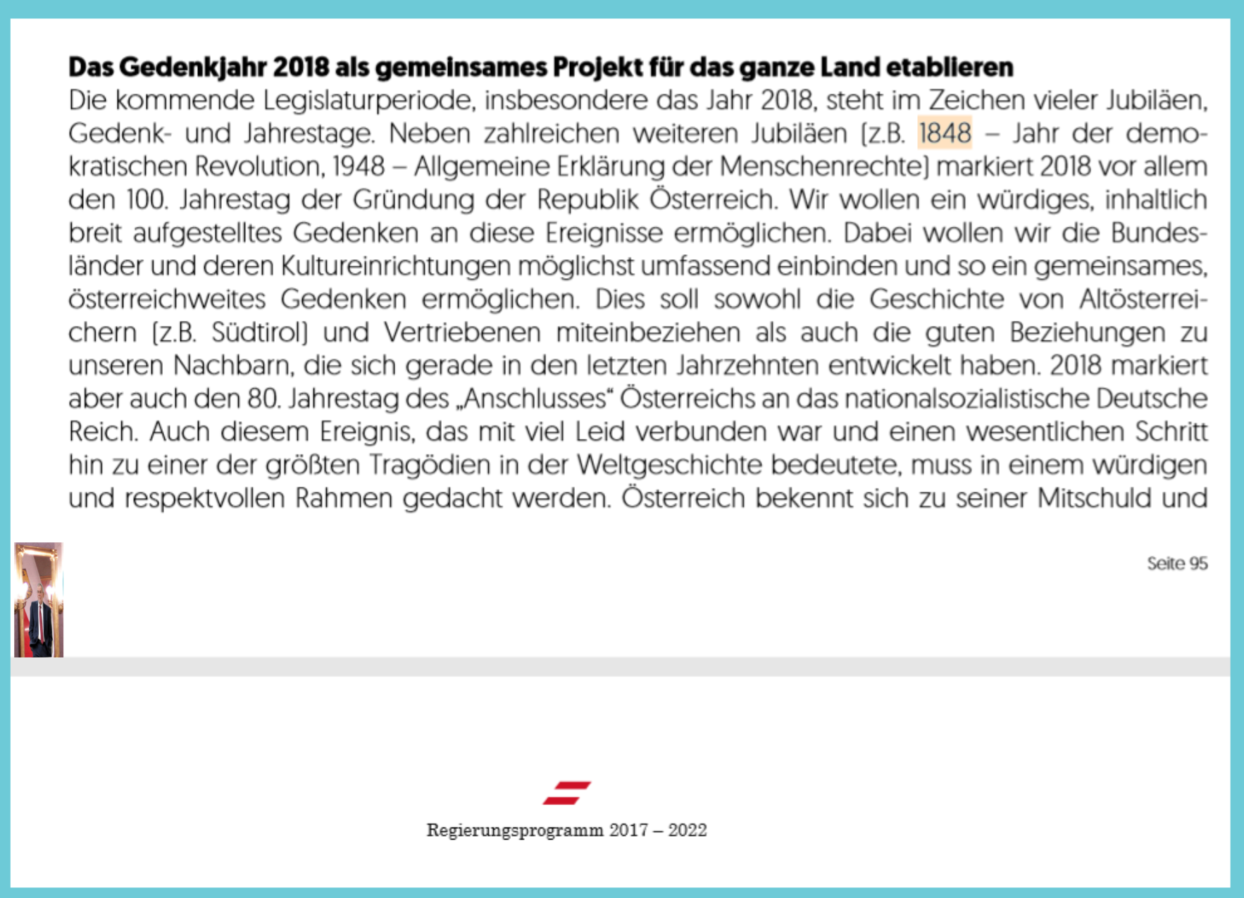 „Die kommende Legislaturperiode, insbesondere das Jahr 2018, steht im Zeichen vieler Jubiläen, Gedenk- und Jahrestage. Neben zahlreichen weiteren Jubiläen (z.B. 1848 – Jahr der demokratischen Revolution, 1948 – Allgemeine Erklärung der Menschenrechte) markiert 2018 vor allem den 100. Jahrestag der Gründung der Republik Österreich. Wir wollen ein würdiges, inhaltlich breit aufgestelltes Gedenken an diese Ereignisse ermöglichen. Dabei wollen wir die Bundesländer und deren Kultureinrichtungen möglichst umfassend einbinden und so ein gemeinsames, österreichweites Gedenken ermöglichen. Dies soll sowohl die Geschichte von Altösterreichern (z.B. Südtirol) und Vertriebenen miteinbeziehen …“