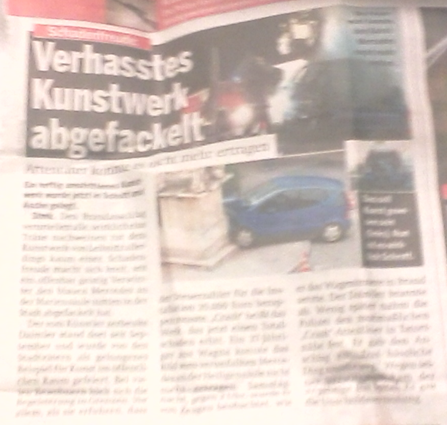 viele Fahrzeuge brennen nach einem Frontalcrash aus, und er wollte die Kunstfigur halt noch echter aussehen lassen. Dass er dabei aber nicht im Einverständnis des Künstlers handelte, ist eine andere Geschichte. Aber wie ein zerdepschtes Auto mit Schrottwert noch einen Restwert von 35.000,- Euro haben kann, erschließt sich mir nicht ganz. Den Artikel muss ich meiner Versicherung nach einem Unfall weiterleiten…