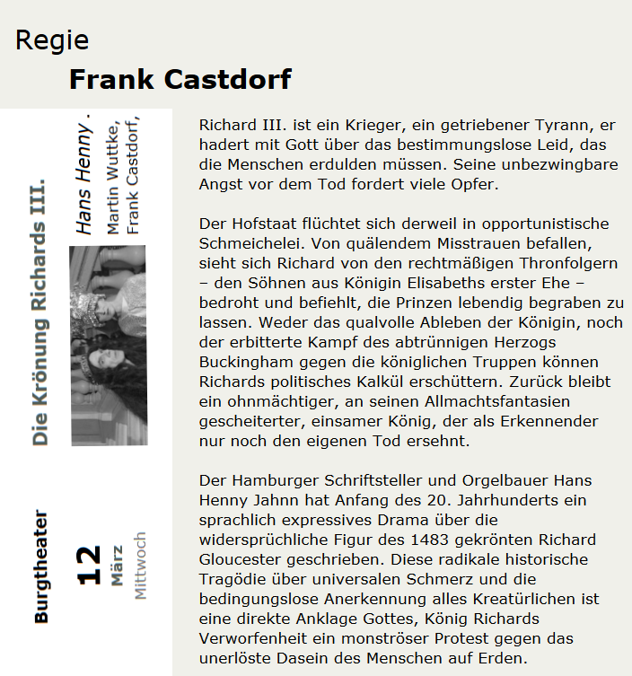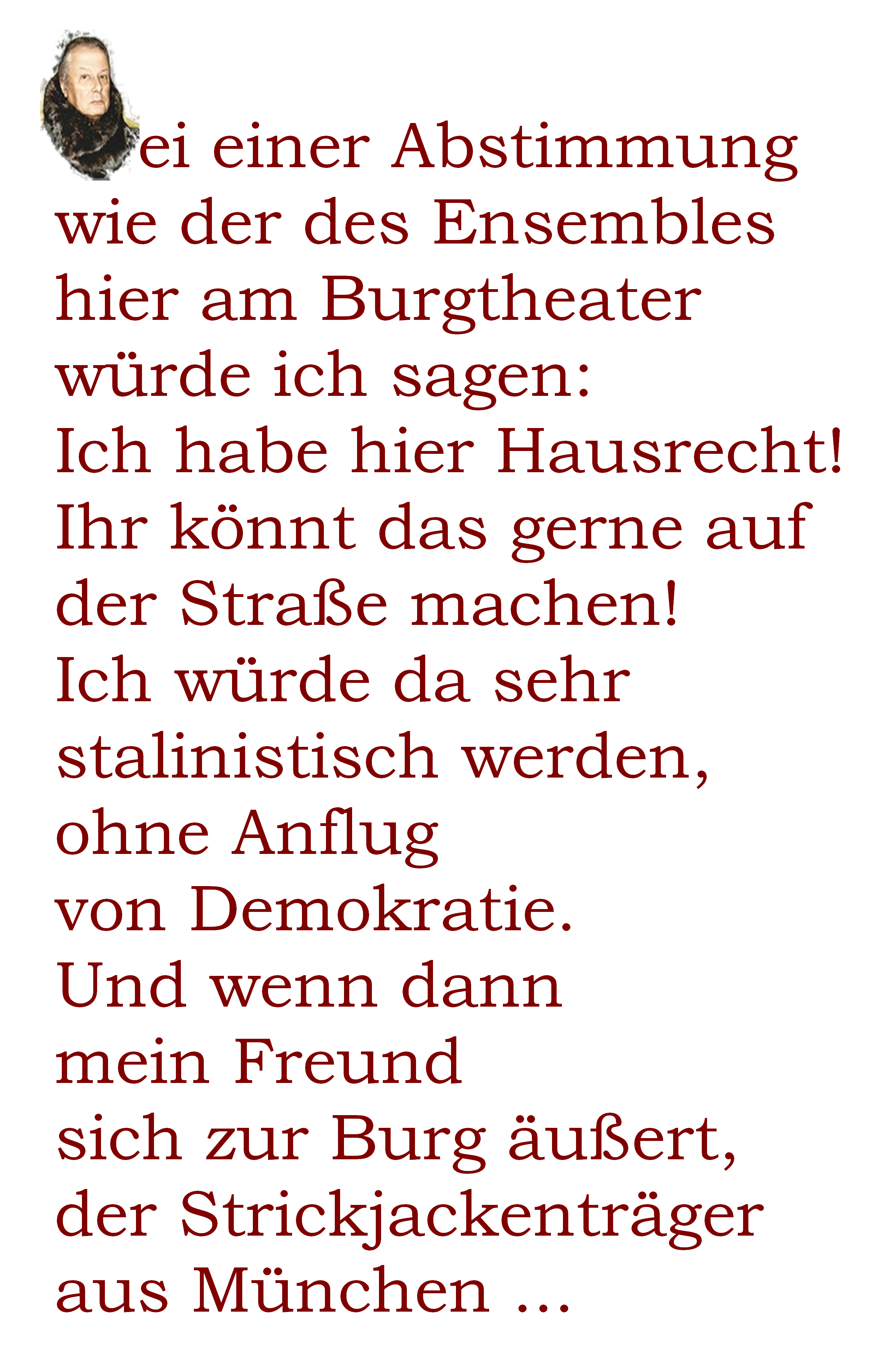 Was tatsächlich für die Qualität dieser österreichischen Zeitung spricht, kann u.v.a.m daran ermessen werden, daß das komplette Stück auch abgedruckt ist. Das ist um so bemerkenswerter, wird bedacht, daß nicht einmal mehr das Burgtheater in seinen Programmheften die zur Aufführung gebrachten Stücke zur Gänze veröffentlicht.