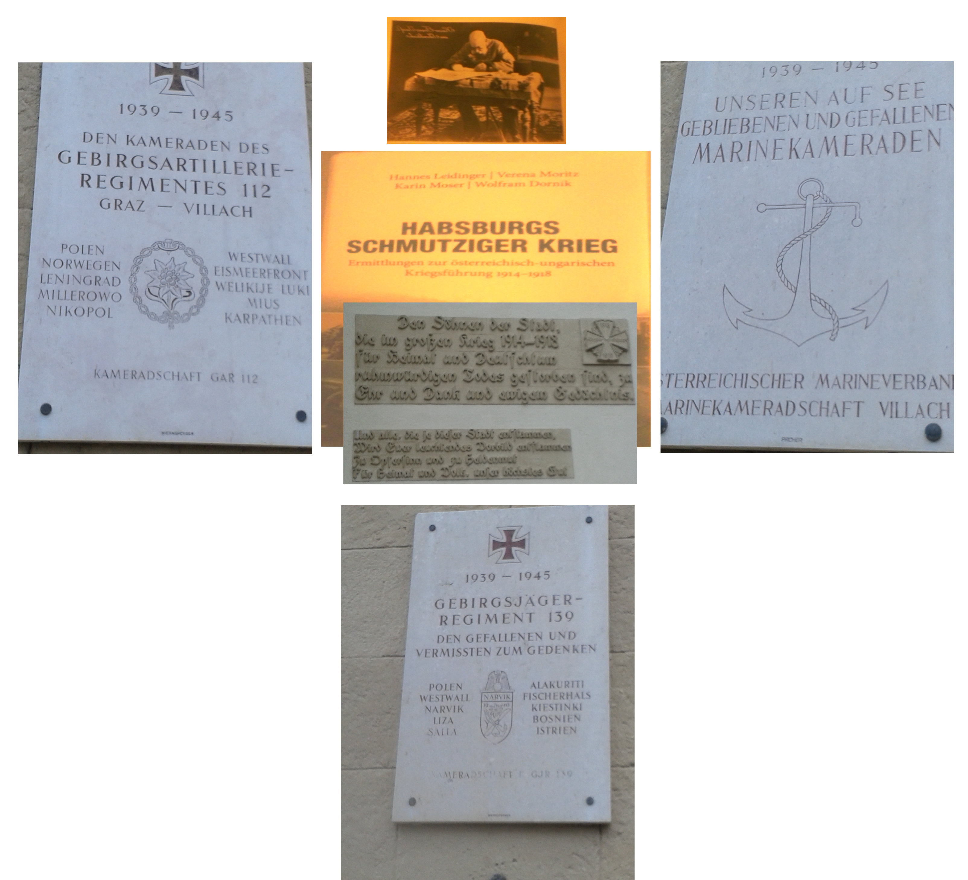 Hingegen etwa das Buch „Habsburgs schmutziger Krieg – Ermittlungen zur österreichisch-ungarischen Kriegsführung 1914-1918“ … Welche „Ehre“ und „Dank“ wofür „zum ewigen Gedächtnis“? Das soll ein „leuchtendes Vorbild entflammen“? Das ist also „unser höchstes Gut“? Auch noch einhundert Jahre später? Festgeschlagen auf der villacherischen Kirche. Zur Vervollständigung dieser „Ehre“ und dieses „Dankes“ und dieses „Deutschtums“ nur ein Beispiel aus diesem Buch zu dem habsburgerischen Schmutzkrieg: