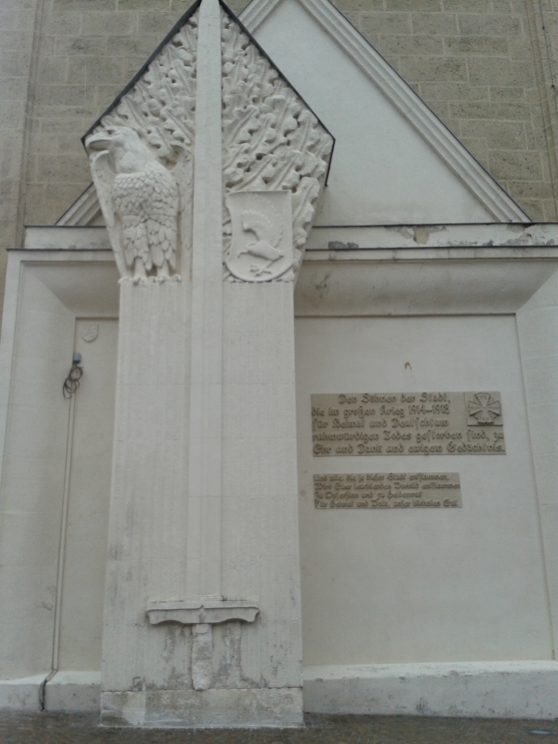 „Den Söhnen der Stadt, die im großen Krieg 1914-1918 für Heimat und Deutschtum ruhmwürdigen Todes gestorben sind, zu Ehr und Dank und ewigem Gedächtnis. Und alle, die je dieser Stadt entstammen, / Wird euer leuchtendes Vorbild entflammen / Zu Opfersinn und zu Heldenmut / Für Heimat und Volk, unser höchstes Gut.“