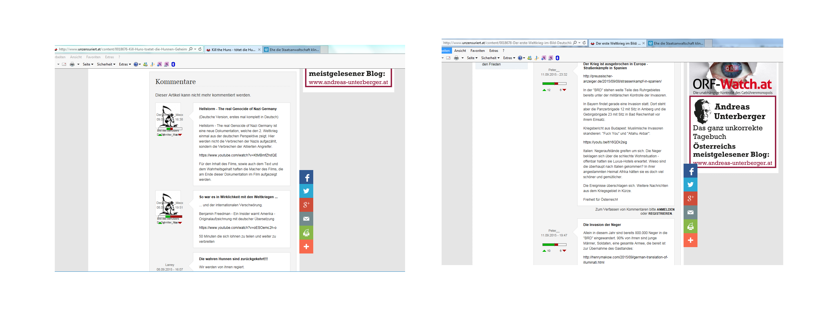 Es wurde zwar heute, 14. September 2015, der Kommentar mit der Aufforderung zur Verbreitung von „Hellstorm“ unter dem Kommentar über den Ersten Weltkrieg gelöscht. Aber unter dem Kommentar „Kill the huns – tötet die Hunnen“ von FPÖ-Unzensuriert ist seit dem 9. September 2015 weiter die Propaganda für „Hellstorm“ mit der Aufforderung zum Verbreiten abrufbar. Wie in der Collage gelesen werden kann.