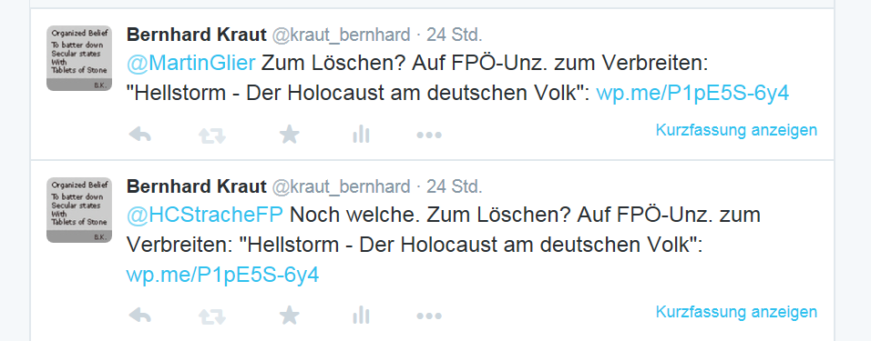 Eines kann aber mit Bestimmtheit nicht sein, daß die FPÖ auf derartige erst Kommentare aufmerksam gemacht werden muß, eine Partei also, die in allen politischen Gremien dieses Landes sitzt. Eine Website also, die als Kolumnistin eine Frau hat, die nebenher Abgeordnete im österreichischen Parlament ist und einmal sogar Bundespräsidentin werden wollte. Und dann erst wird reagiert. Darüber hinaus sollten eigentlich die österreichischen Gesetze auch in dieser Partei bekannt sein, daß nicht erst wer von außerhalb dieser Partei darauf aufmerksam machen muß. Und was ist die Folge, die FPÖ, von He.-Chr. Strache aufwärts, direkt zu informieren über derartige Ungeheuerlichkeiten? Mühle auf, Mühle zu. Einmal „Hellstorm“ löschen, einmal „Hellstorm“ veröffentlicht lassen.