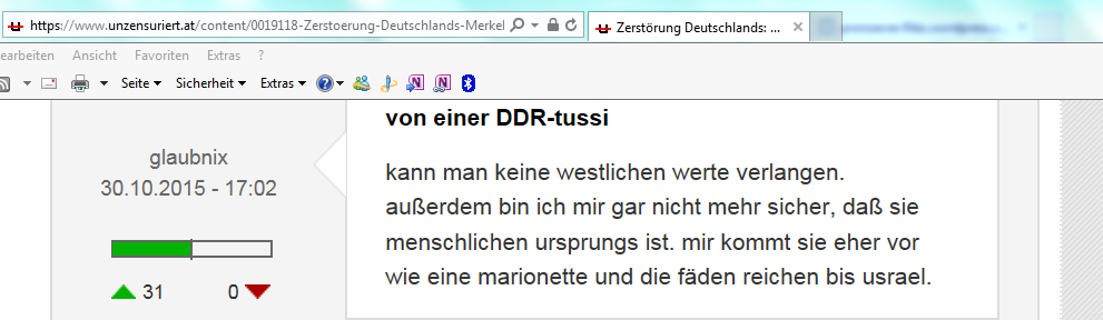 Und weil es diesmal, wieder einmal, um Antisemitisches geht, kann mit einem weiteren Beispiel aufgewartet werden. Seit dem 30. Oktober kann auf FPÖ unzensuriert gelesen werden: „und die fäden reichen bis usreal.“ Es paßt zu dieser Gesinnung auch dazu, daß einem Menschen, wie gelesen werden kann, sein Menschsein abgesprochen wird, im konkreten Fall: Angela Merkel. Und derartige Kommentare finden, wie gelesen werden kann, reichlich Zustimmung von anderen Leserinnen und Lesern, wenn FPÖ unzensuriert … Es wird deshalb nicht wieder die FPÖ und namentlich He.-Chr. Strache gedrängt werden, das zu löschen, denn es kann nicht die Aufgabe von Bürgern und Bürgerinnen sein, wie hier schon oft geschrieben wurde, die Arbeit für eine Partei, die in allen politischen Gremien dieses Landes sitzt, zu leisten, damit diese ihre Medien von derartigen Ungeheuerlichkeiten … Ein weiteres Mal die FPÖ und dann wieder mehrmals He.-Chr. Strache direkt darauf hinzuweisen, dafür zu sorgen, wie beispielsweise bei den revisionistischen Werbekommentaren für „Hellstorm“ auf FPÖ unzensuriert … es wurden dann auch alle „Hellstorm“-Werbekommentare tatsächlich gelöscht, wohl aber nur aus wahlopportunistischen Gründen. Einer von diesen auch der Staatsanwaltschaft bekanntgemachten „Hellstorm“-Werbern schreibt aber auf FPÖ unzensuriert gesinnungstreumunter weiter …