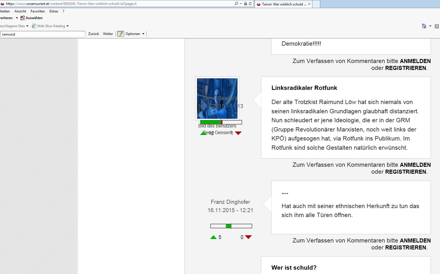 Der alte Trotzkist Raimund Löw hat sich niemals von seinen linksradikalen Grundlagen glaubhaft distanziert. Nun schleudert er jene Ideologie, die er in der GRM (Gruppe Revolutionärer Marxisten, noch weit links der KPÖ) aufgesogen hat, via Rotfunk ins Publikum. Im Rotfunk sind solche Gestalten natürlich erwünscht