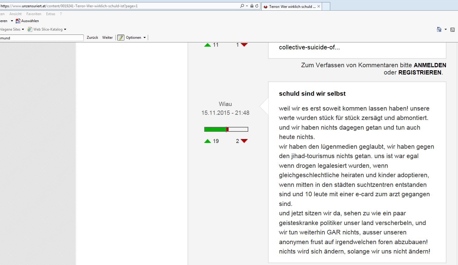 weil wir es erst soweit kommen lassen haben! unsere werte wurden stück für stück zersägt und abmontiert. und wir haben nichts dagegen getan und tun auch heute nichts. wir haben den lügenmedien geglaubt, wir haben gegen den jihad-tourismus nichts getan. uns ist war egal wenn drogen legalesiert wurden, wenn gleichgeschlechtliche heiraten und kinder adoptieren, wenn mitten in den städten suchtzentren entstanden sind und 10 leute mit einer e-card zum arzt gegangen sind. und jetzt sitzen wir da, sehen zu wie ein paar geisteskranke politiker unser land verscherbeln, und wir tun weiterhin GAR nichts, ausser unseren anonymen frust auf irgendwelchen foren abzubauen! nichts wird sich ändern, solange wir uns nicht ändern!