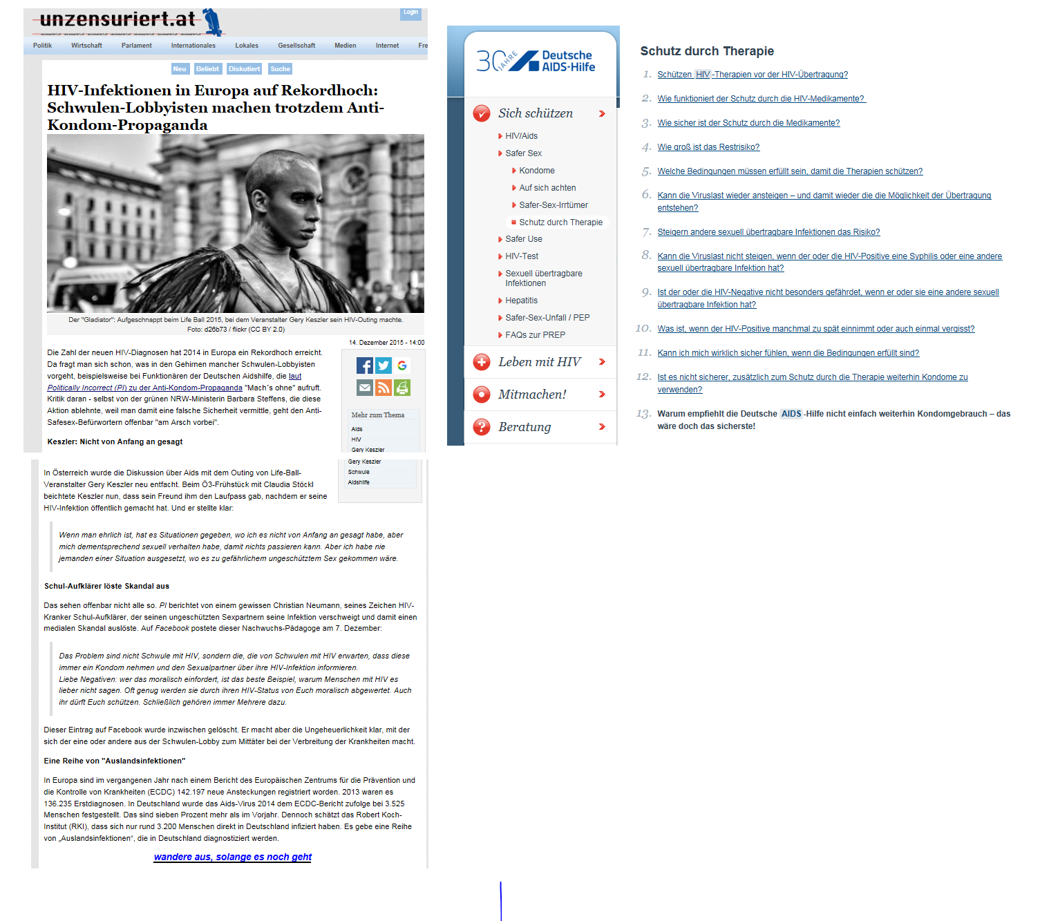 Und weil in diesem Kommentar die Deutsche Aidshilfe direkt angesprochen wird, freilich nicht, um diese für ihre umfassende Informationen lobend zu erwähnen, sondern ganz im Gegenteil, ist in der Collage dem FPÖ-unzensuriert-Kommentar die umfassende Information der Deutschen Aidshilfe beigestellt, die auf einen ersten Blick hin bereits zeigt, wie verantwortungsvoll und umfassend informativ mit einem Thema umgegangen werden kann, daß gesagt werden kann, glücklicherweise ist beispielsweise die Aidshilfe in Deutschland keine wie immer geartete Organisation der FPÖ …