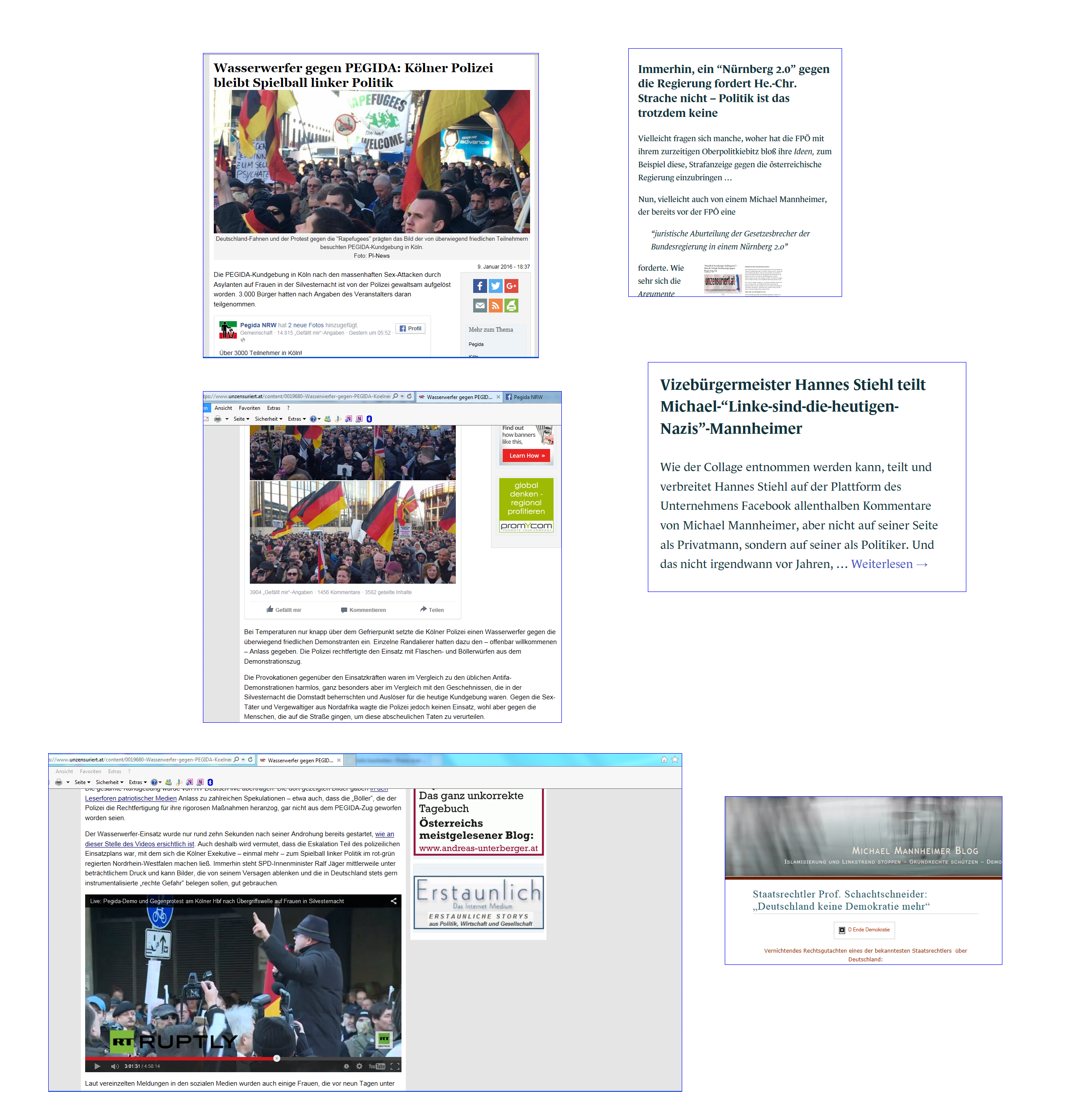 Michael Mannheimer wäre nicht erwähnenswert, aber er ist erwähnenswert, weil die Demonstration vom 9. Jänner 2016, auf der er schrie, auch von der FPÖ unzensuriert in einem Kommentar schon am 9. Jänner 2016 herzzerreißend beschrieben wird, auf eine Art, die zeigt, es sind keine herzlosen Menschen, wie oft über diese Gemein-Schaft zu hören ist, sie können recht viel Herz aufbringen für deutsche Menschen, die das Herz am rechten Fleck recht patriotisch …