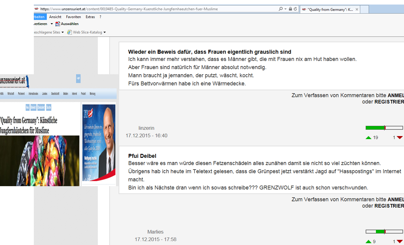 PS Es sind, wird stets gesagt, bloß vereinzelte Meinungen, wie sie vorwiegend auf der gesinnungsgemäß zensierten Website der identitären Gemein-Schaft geäußert werden, aber es sind Meinungen, die viel zu viel Zustimmung erfahren, wie auch diesmal, auf der Website einer Partei, die viele, viel zu viele Stimmen in Wahlen bekommt.
