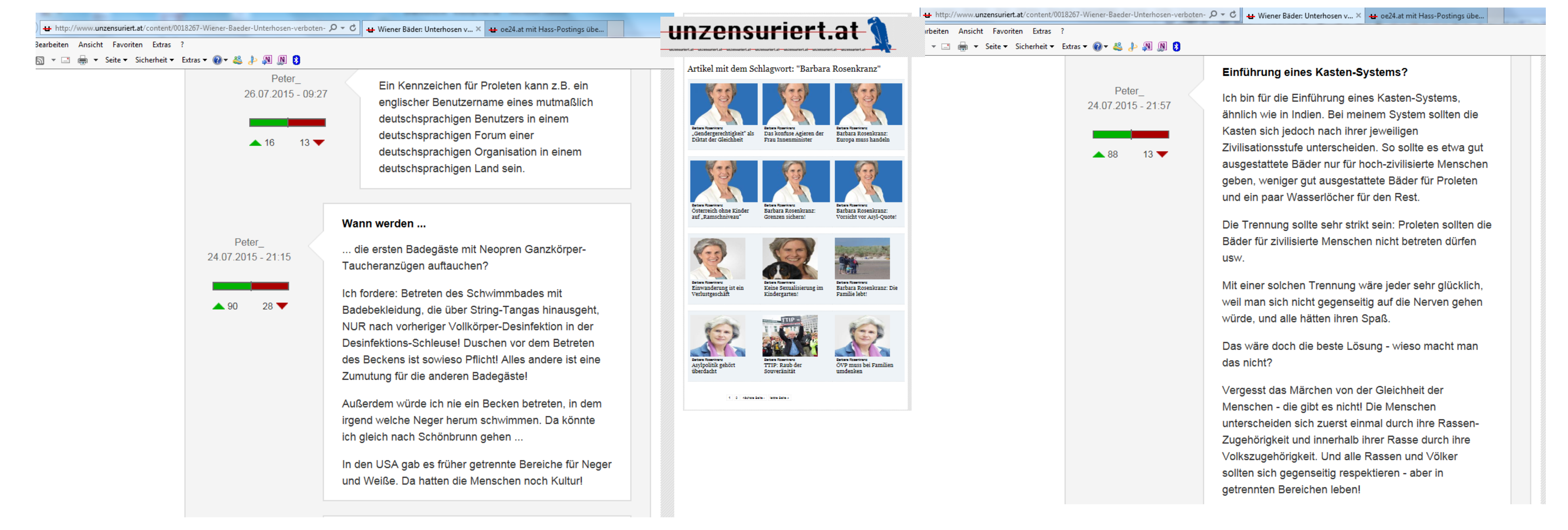Erschreckend an diesen Kommentaren sind nicht die ohnehin bis zum Überdruß bekannten übl(ich))en Beleidigungen und Diffamierungen, das Verwenden des Wortes „Neger“ beispielsweise, sondern in Österreich ein „Kastensystem“ einführen zu wollen. Diesen abstoßenden Aberwitz können Sie in der Collage nachlesen, wenn Sie sich gerade unwohl fühlen, und ein Mittel zum Erbrechen suchen.