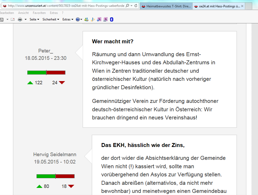 Es könnte gedacht werden, daß FPÖ-Unzensuriert nach Einschaltung der Staatsanwaltschaft wegen eines Postings von einem aus ihrer Schreibstaffel besonders darauf achtet, was dieser noch für Kommentare auf der FPÖ-Unzensuriert hinterläßt. Aber Peter_ darf auch Wochen nach Einschaltung der Staatsanwaltschaft Kommentare veröffentlichen. Wie beispielsweise am 24. und 26. Juli 2015. Erschreckend dabei wieder einmal die Zustimmungen zu diesen grausdunklen Ideen aus der schwärzesten Vergangenheit, die es auch in Österreich gab.