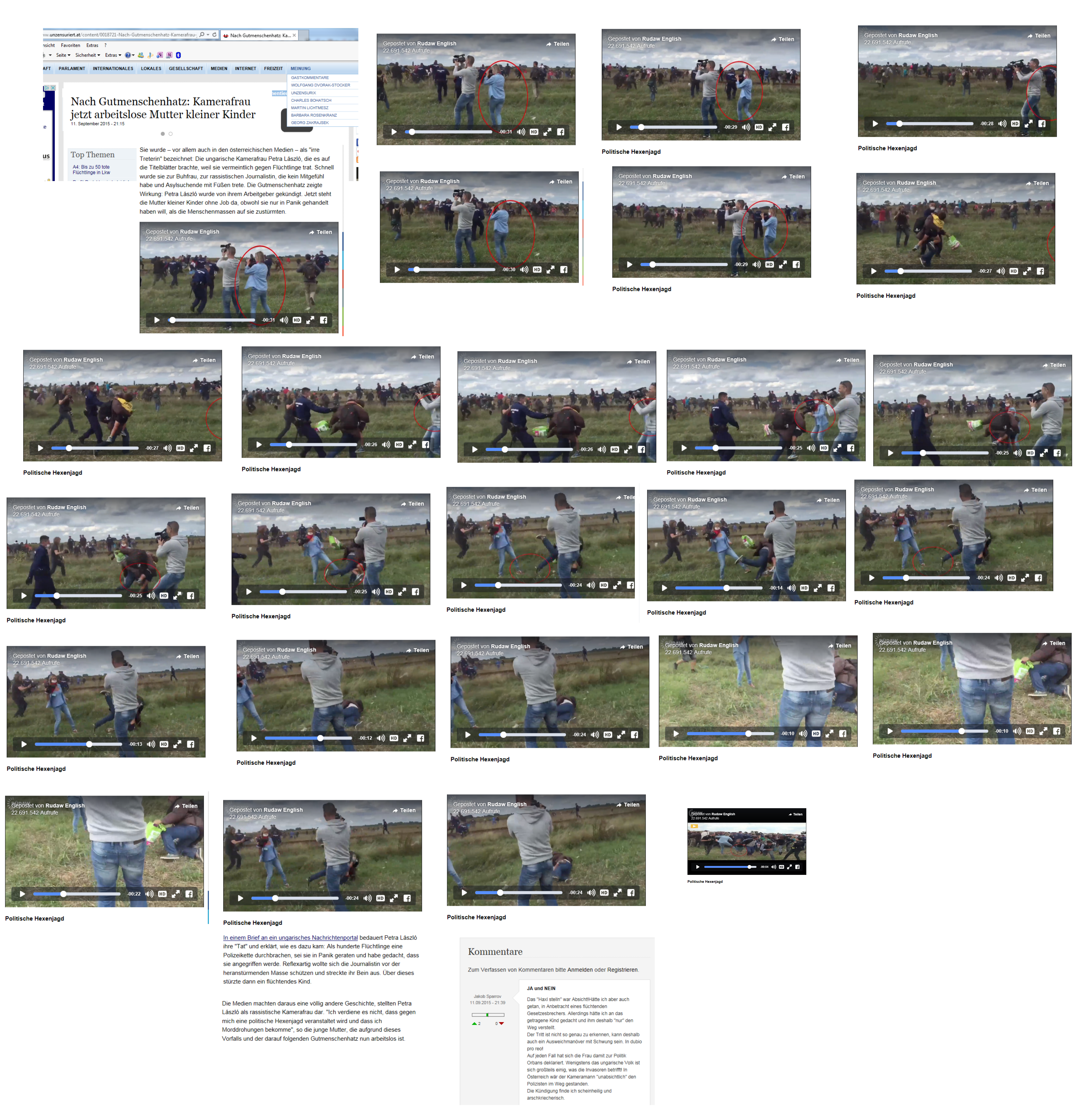 „Als die Menschenmasen auf sie zustürmten“, also auf die Journalistin, die einem Mann, der ein Kind trägt, das Bein stellt. Die Bilder aus dem Video passen nicht dazu, wie die Wahrheit nicht zu dieser identitären Gemein-Schaft mit gesinnungsgemäß zensierten Website paßt. Die Standbilder aus dem Video verdeutlichen das wohl eindrücklicher, als das Abspielen des Videos allein. Mehr muß dazu nicht geschrieben werden. Die Bilder im Abgleich mit dem FPÖ-Unzensuriert-Kommentar sagen alles, was zu sagen ist.