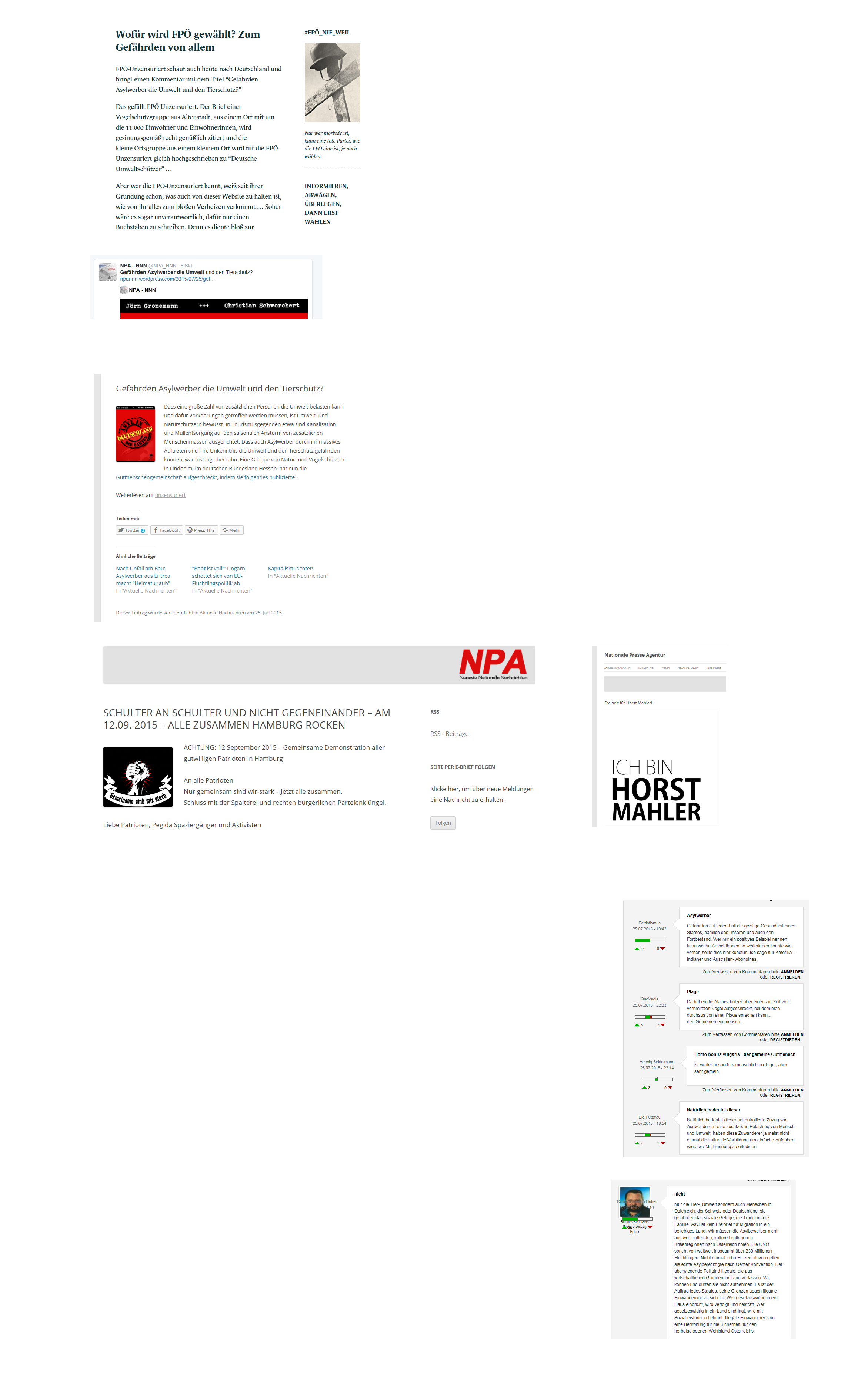Während FPÖ-Unzensuriert zwei Monate brauchte, um wieder Unbrauchbares, aber für ihre Zwecke zum Verheizen für sie wieder Geeignetes zu finden, braucht die NPA (Neueste Nationale Nachrichten) keinen Vierteltag, um den Kommentar von FPÖ-Unzensuriert auf ihrer Website und über die Plattform des Unternehmens Twitter zu verbreiten. Wie deren Gesinnung ist? Nun, die ist recht klar. Zwei Beispiele sind dafür zur Verdeutlichung in die Collage aufgenommen. „Freiheit für Horst Mahler“ … Wo er auftrat, ließen es sich freiheitliche NRs ehrenvoll nicht nehmen, ebenfalls …