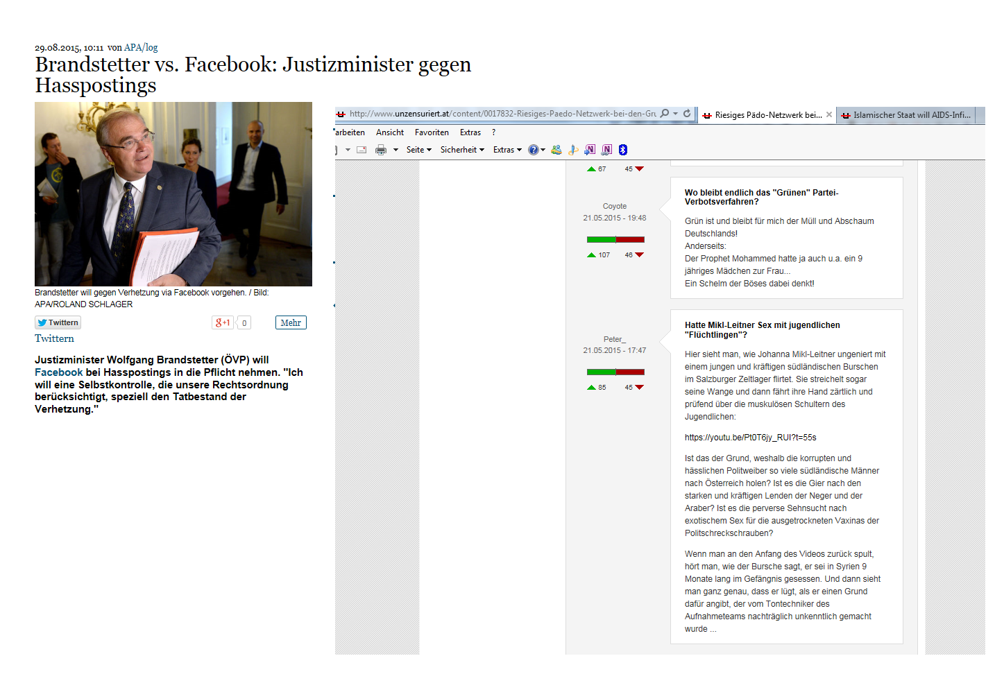 Es geht also, Wolfgang Brandstetter, nicht nur um „Hasspostings“, sondern auch Gesetzesverstöße mannigfacher Art, auf einer österreichischen Website. Welche Gesetzesverstöße das sind, das wissen Sie als Justizminister selbst nur zu genau. Und alle nicht auf Facebook begangen, irgendwo auf der Welt, sondern auf einer in Österreich verorteten Domain von einer österreichischen Partei, die in allen politischen Gremien dieses Landes sitzt. Und gerade bei Peter_ aus der Schreibstaffel der FPÖ-Unzensuriert