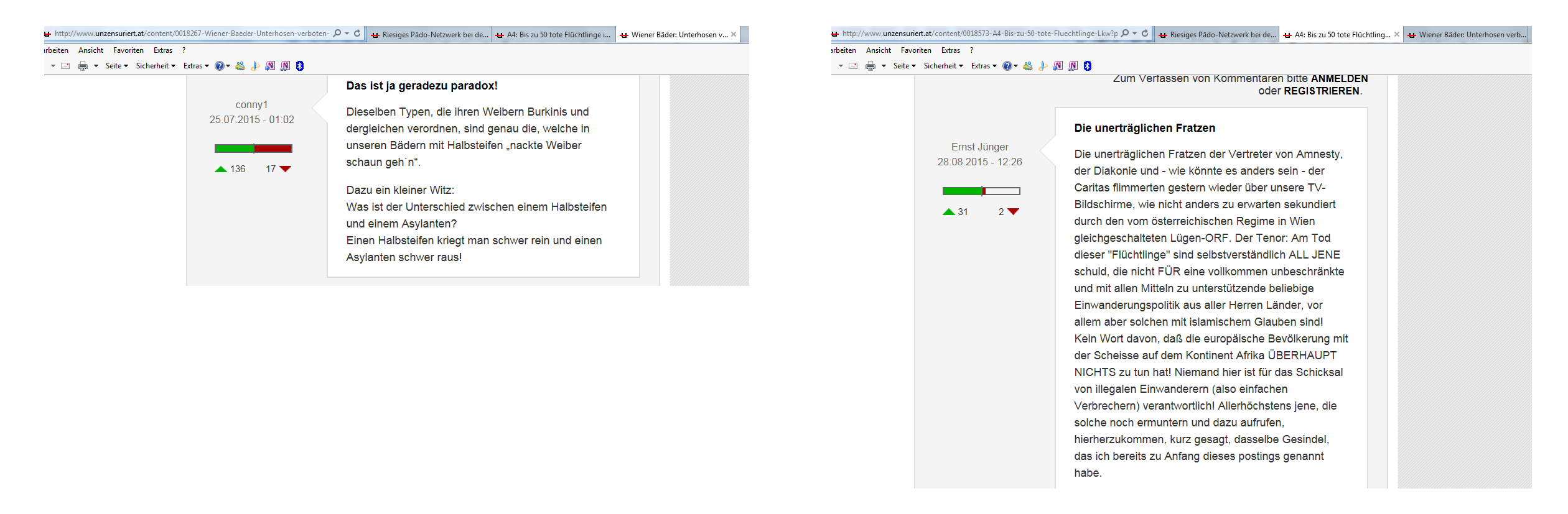 Ja, wenn beim Lesen die Augen recht fest geschlossen bleiben, dann ist auch ein Justizminister der Schwarzen zu verstehen, wenn er das Unternehmen Facebook, aber nicht die Unzensuriert einer österreichischen Partei mit einer österreichischen Domain in die Pflicht nehmen will. Vielleicht können Schwarze der überaus sachlichen und fundierten raschen Analyse von einem aus der FPÖ-Unzensuriert-Schreibstaffel mit einem Namen, der es bereits offensichtlich macht, welcher Gesinnungswind auf FPÖ-Unzensuriert weht, nämlich Ernst Jünger, am 28. August 2015 zu den einundsiebzig toten Flüchtlingen, daß „niemand verantwortlich“ ist für das „Schicksal“ von „also einfachen Verbrechern“.