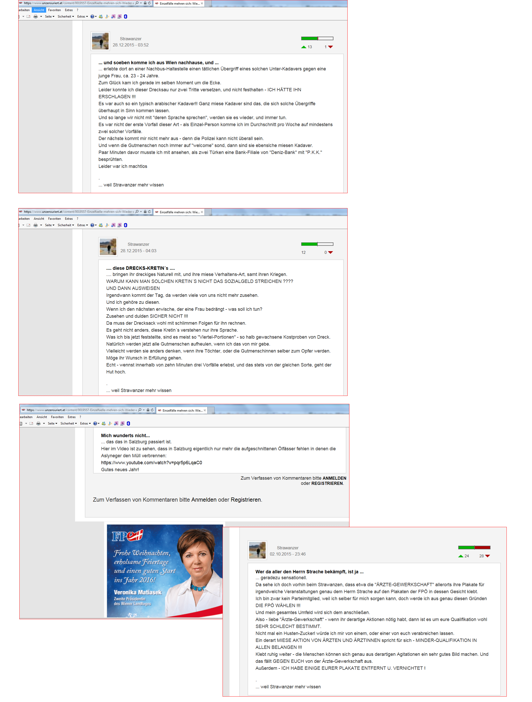 Es ist nicht notwendig zu zitieren, was ein Schreibstaffler der gesinnungsgemäß zensierten Website der FPÖ am 28. Dezember 2015 von sich gibt – bei Interesse jedoch, die Collage öffnen und auf entsprechend lesbare Größe zoomen …