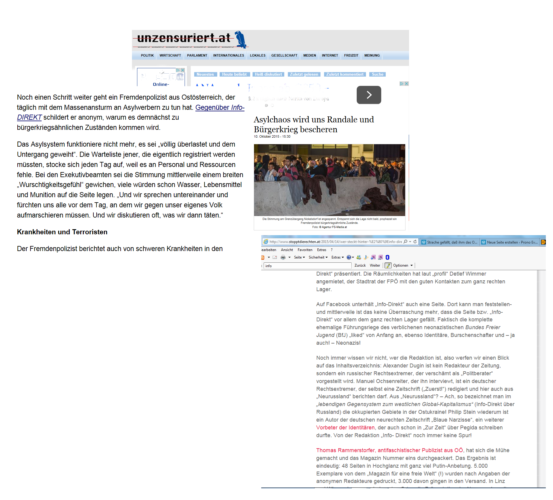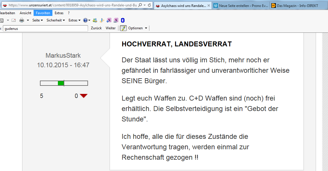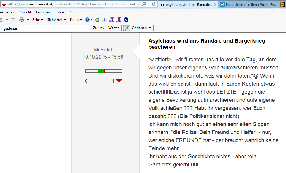 Daß die identitäre Gemein-Schaft aus dem Gestern auch heute, am 10. Oktober 2015, weiter Stimmung macht auf ihrer gesinnungsgemäß zensierten Website, war, ist und wird und nicht nur knapp vor Wahlen stets zu erwarten sein. Aber es ist keine Verhetzung, keine Hetze, die diese Partei betreibt, denn diese Partei, die so viel von der Freiheit hält, die so viel vom Denken hält, weiß recht genau, auf Hetze, auf Verhetzung kann nur hereinfallen, der nicht selber denkt. Also Sie als Wählerin fallen darauf kaum herein, Sie als Wähler jedoch sind nicht frei von Gefährdung, also auf Hetze und Verhetzung hereinfallen zu wollen.