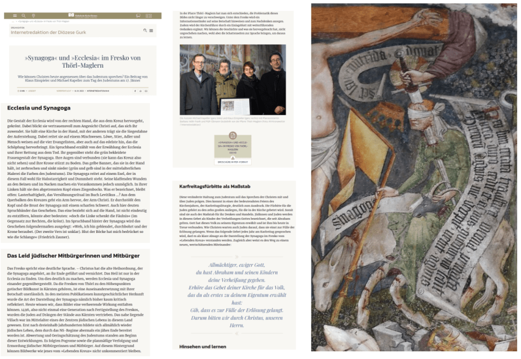 Im Gegensatz zum drastisch unmißverständlichen, barbarischen Relief in der Jordangasse unter dem Villach-Fresko ein Ständer, mit Information. Wann der Informationsständer hingestellt wurde, seit wann es diesen Ständer gibt, wird nicht gewußt. Vielleicht erst seit dem Jänner 2023. Jedenfalls läßt die mit 17. Jänner 2023 datierte Broschüre „Die Darstellung von Synagoga und Ecclesia im Fresko vom ‚Lebenden Kreuz'“darauf schließen, aber auch der mit einem QR-Code versehene zum Fresko hingestellte Informationstext, mit dem direkt auf die Website der katholischen Kirche Kärntens zu gelangen ist, zum am 16. Jänner 2023 veröffentlichten Text „‚Synagoga‘ und ‚Ecclesia‘ im Fresko von Thörl-Maglern“ …