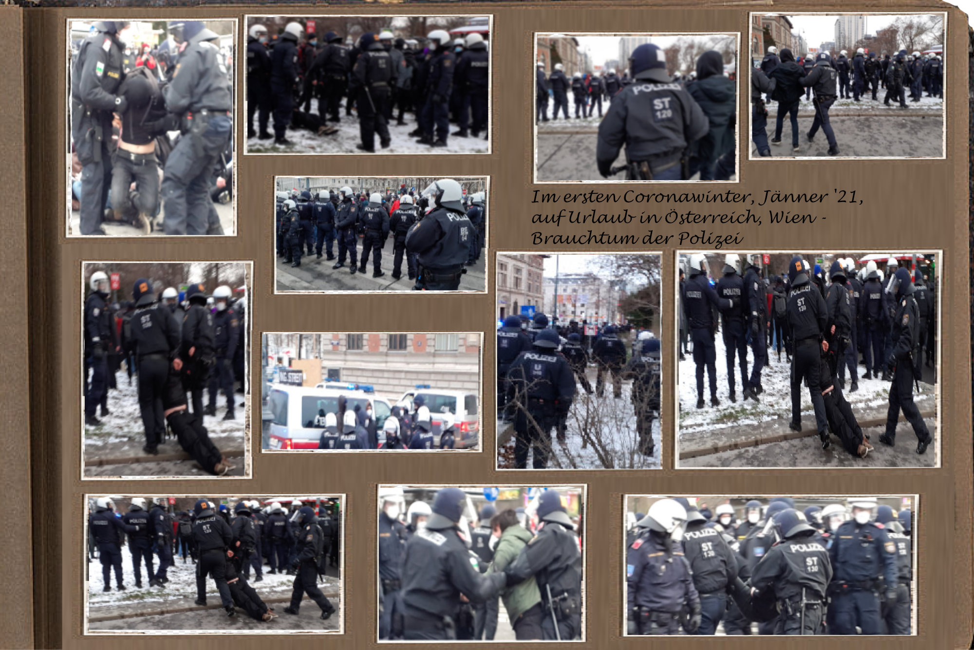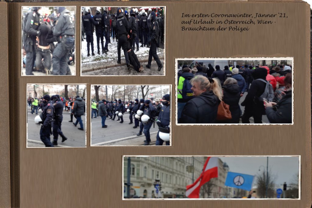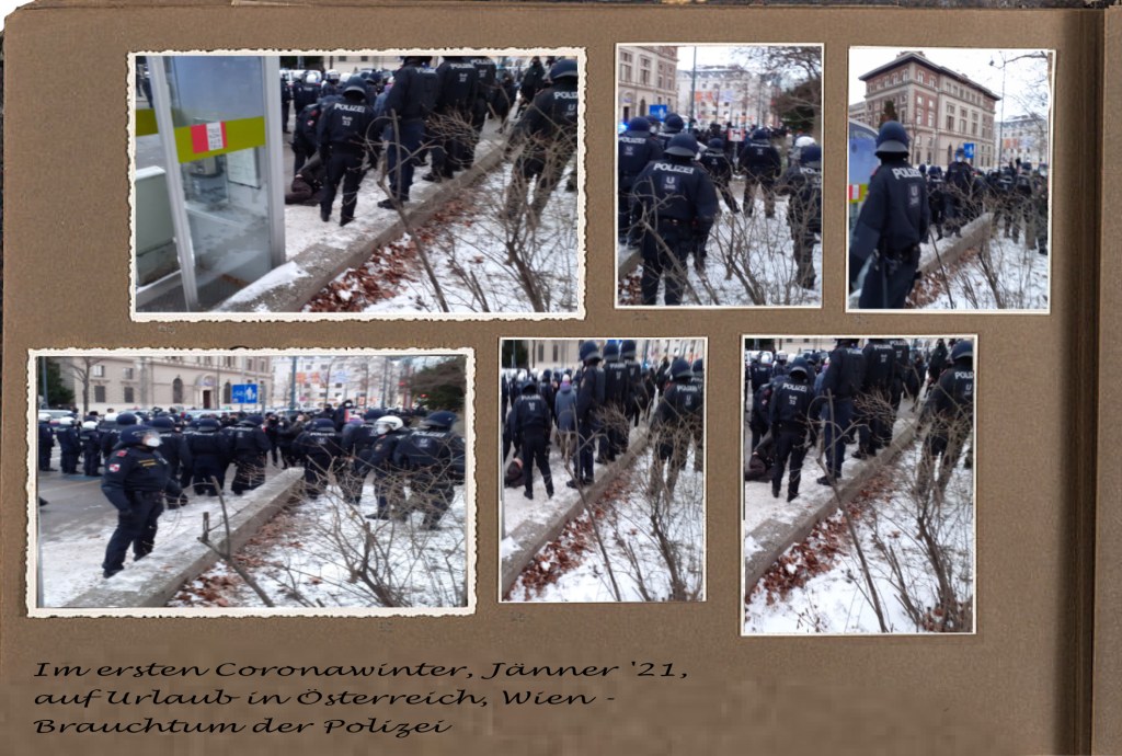 Als ein Mensch aus einem geographisch von Österreich weit entfernten Land gab es an diesem Wintersamstag in Wien beim Zuschauen der Demonstration auf der freudlosen Gasse, die die Innenstadt ringförmig umschließt, einen besonderen Einblick in diese für ihn bisher gänzlich unbekannte Kultur. Es war die Polizei, die in den Mittelpunkt der Aufmerksamkeit sich rückte. Als eine Ahnung, diese österreichische Kultur von einer Sekunde auf die andere ganz verstehen zu können, wenn das Verhalten der Polizei in diesem bis dahin noch nie besuchten Land verstanden werden kann.