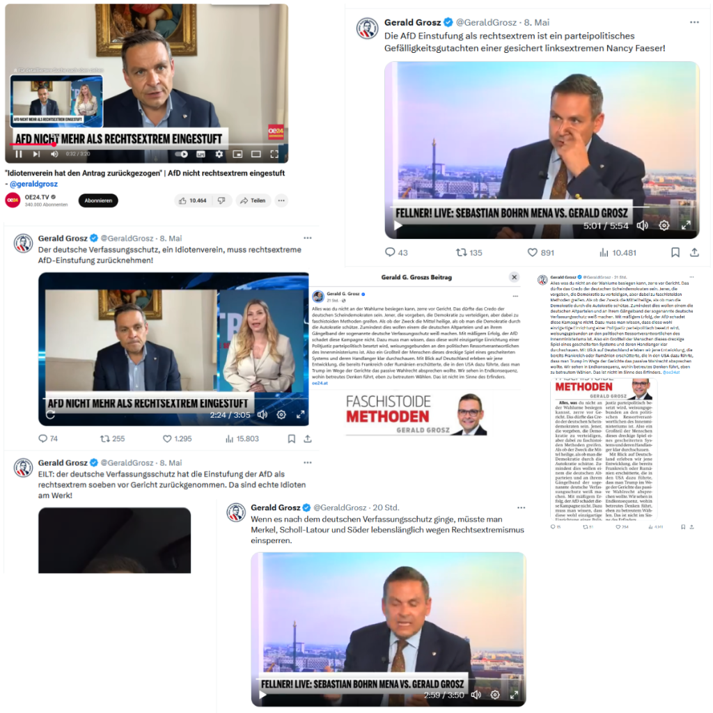 Am 8. Mai 2025 verbreitet Gerald Grosz dies und nicht nur am 8. Mai auf der Konzernplattform X und nicht nur auf dieser Konzernplattform u. a. m. mit einem Ausschnitt aus dem verantwortlichen Medium Fellner, dessen Inhalt er selbst ist, und er will damit wohl nicht nur für das dafür verantwortliche Medium Reklame machen, sondern auch seine eigene Seriösität —