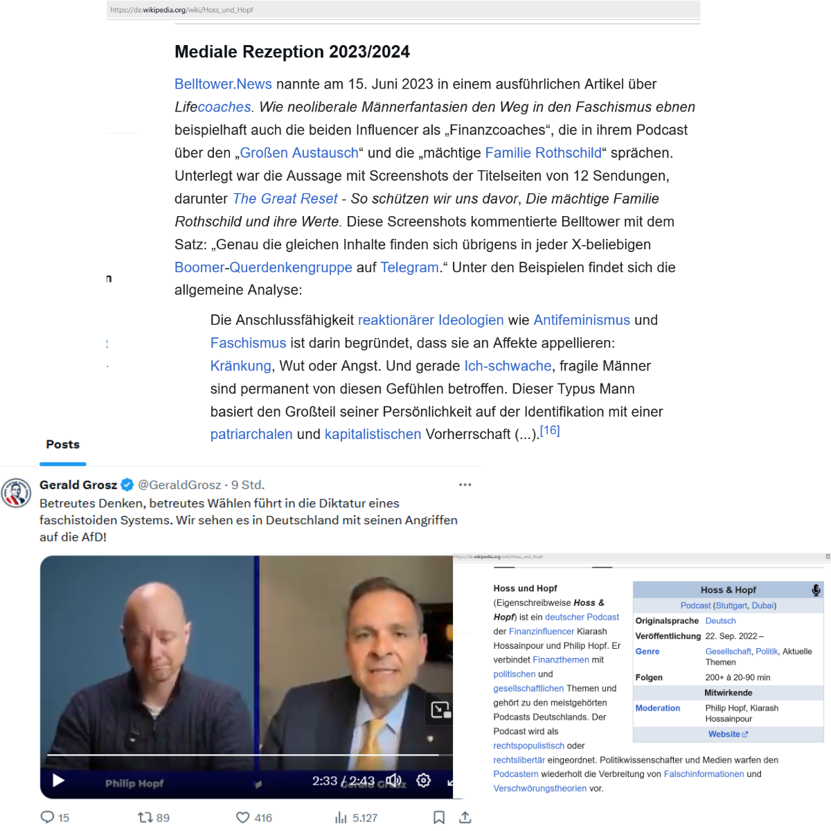 NS Aber auch außerhalb von Österreich ist Gerald Grosz gar recht gefragt, etwa beim Kurier des Deutschlands, auch ein Philip Hopf lädt ihn zu Befragungen ein, deren Podcast u. v. a. m. als „libertär“ eingeordnet wird,