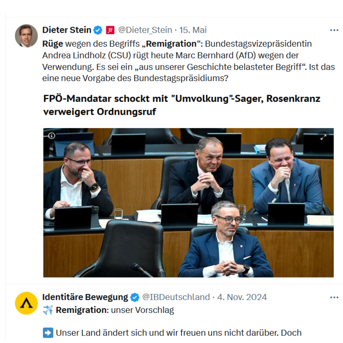 das sind Begriffe u. v. a. m.: „Umvolkung“, „Remigration“, „Bevölkerungsaustausch“, „Großer Austausch“ also Begriffe, die in Österreich ehrenwerte sind,