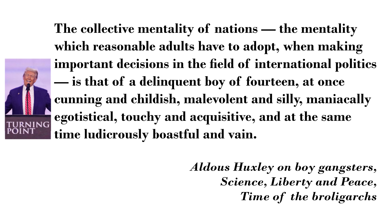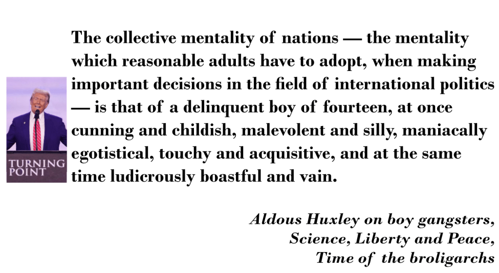 und wer würde bei dieser zutreffenden Beschreibung an Nationen, gar an eine bestimmte Nation denken, sehr wohl aber augenblicklich in den Sinn wird kommen, in der huxley’schen Gegenwart, und sofort wird exemplarisch und auch stellvertretend für diese vierzehnjährigen Straftäterinnen Donald Trump genannt werden. He, Trump, is just one delinquent boy from the boy gangsters —