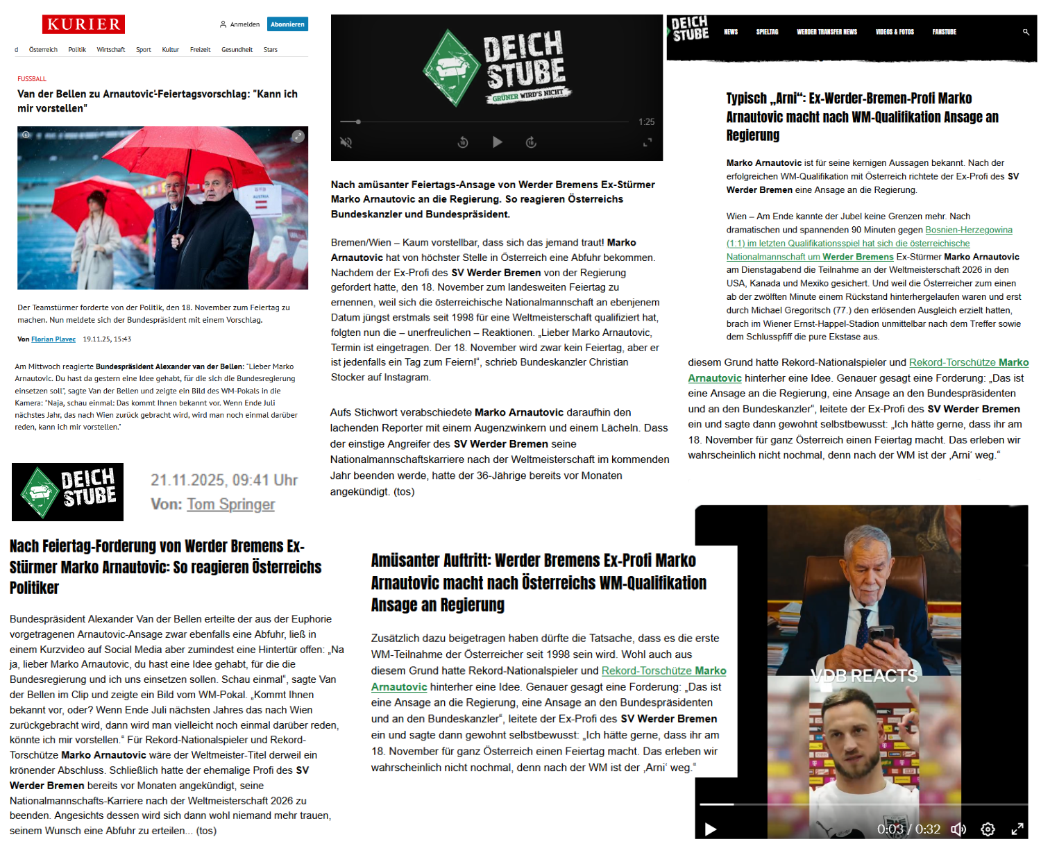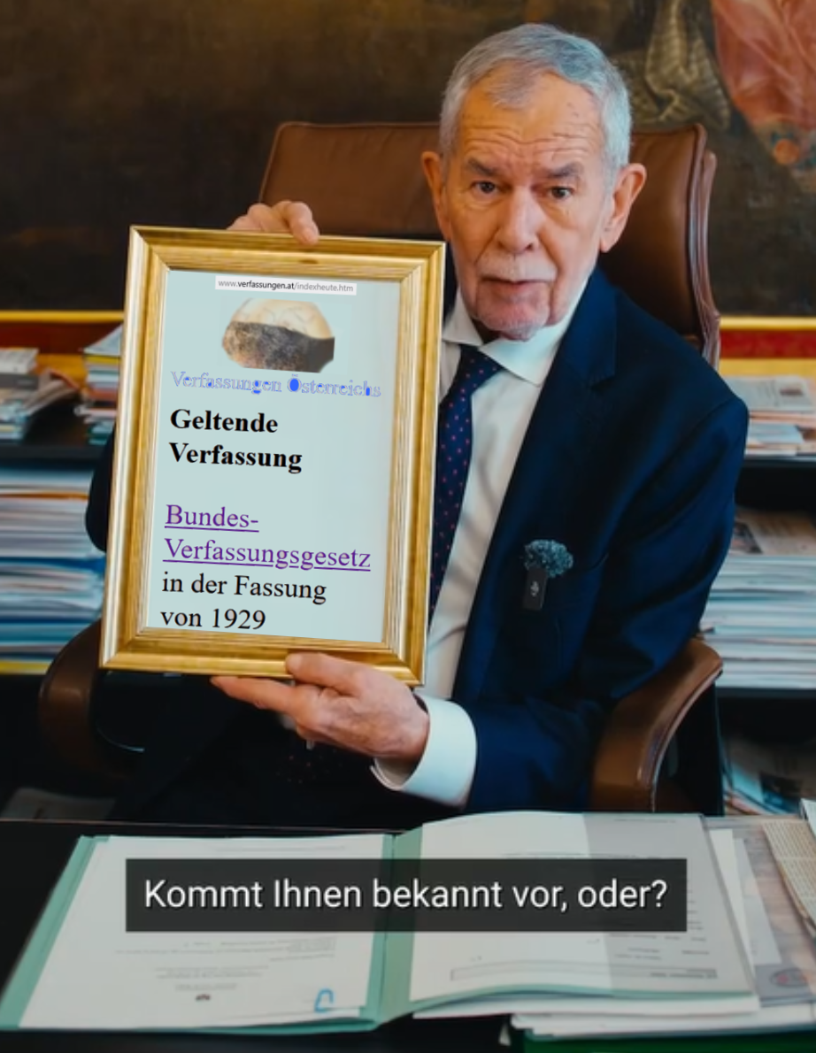 Bundespräsident: Sehr nett! Na ja. Lieber Marko Arnautović, Du hast gestern abend eine Idee ghobt, für die die Bundesregierung und ich uns einsetzen soll’n. Na joa. Schau mal. Kommt Ihnen bekannt vor, oder? Wenn Ende Juli nächstes Joahr des nach Wien zurückgebracht wird, dann könnt‘ ma vielleicht noch amol red’n, könnt‘ ich mir vorstell’n, hm?