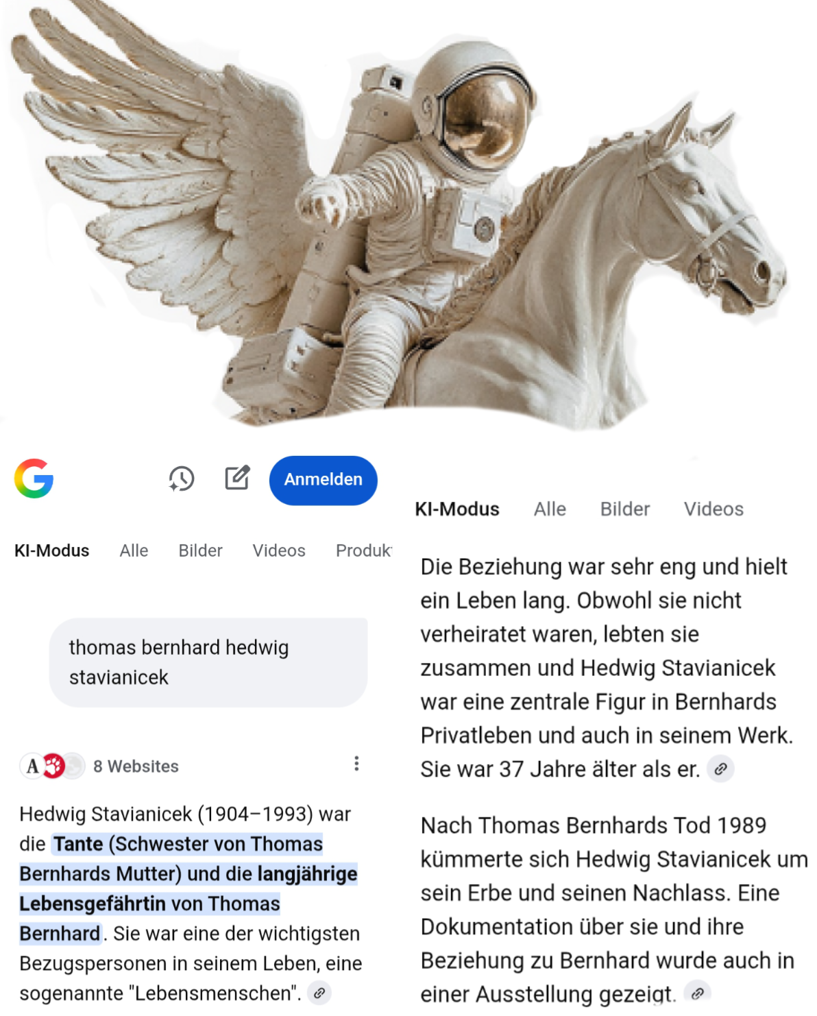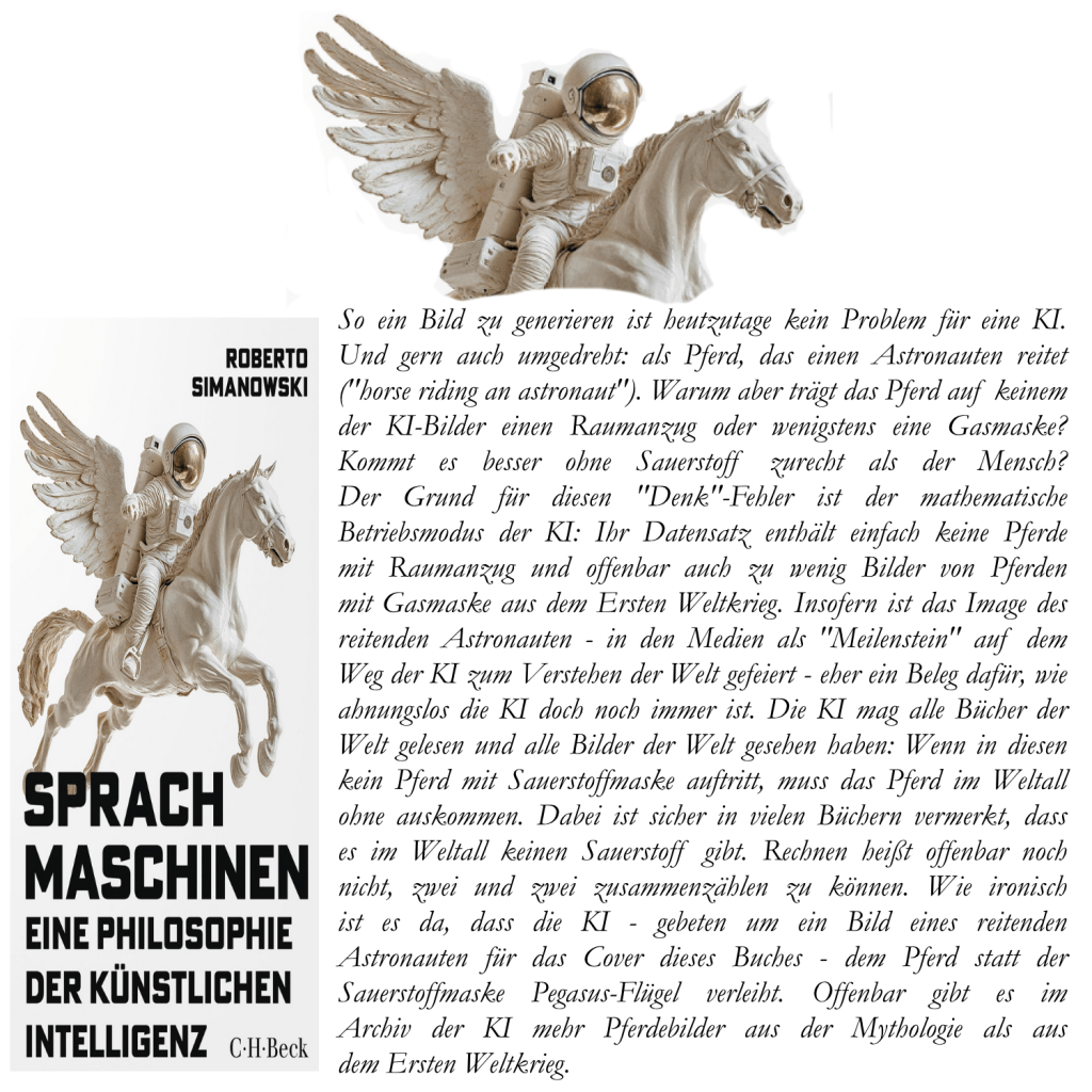 Einen Witz noch, dieser kann nur gezeigt werden, denn es ist ein Witz ohne Worte (AI – Joke without words): Astronaut riding a horse … Es muß zugegeben werden, diesen KI – Bildwitz erst verstanden zu haben, als diesen Roberto Simanowski verständlich machte. Genauer. Erst durch seine Ausführung wurde klar, daß es sich beim reitenden Astronauten um einen Bildwitz handelt, davor wurde es als eine selbstverständliche und nicht zu hinterfragende Abbildung gesehen, die wirklich und wahr darstellt, wie es wäre, wenn eine Astronautin mit der für sie lebensnotwendigen Ausrüstung zum Beispiel auf dem Mond ein Pferd ritte, das selbst aber keinen lebensnotwendigen Raumanzug benötigt, weil die Flügel die evolutionäre Weiterentwicklung des Pferdes für das Überleben in einer sauerstofflosen Umwelt ist, das heißt, die Flügel die Funktion in der für den Mond erforderlichen und entsprechend angepassten Weise haben, die beispielsweise auf der sauerstoffreichen Erde der Atmungstrakt …