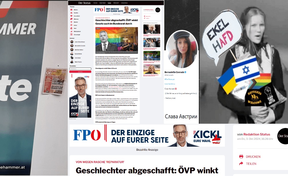 Zuerst was Christian Hafenecker von der identitären Parlamentspartei am 23. September ’24 in der mit dem ihm zur Seite wichtigtuenden P. W. veranstalteten Pressekonferenz sagt, dann, für wen er, die er „Journalisten“ nennt, ausrückte, und dann noch, was er nicht sagt.