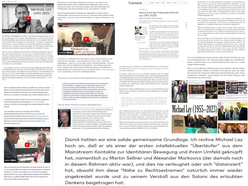 Ein Buch haben Ley und ich zusammen verantwortet: Den Sammelband Nationalmasochismus, erschienen 2018, der außer unseren eigenen Beiträgen Texte von Caroline Sommerfeld, Siegfried Gerlich, Michael Klonovsky, Tilman Nagel, Andreas Unterberger und Michael Mannheimer […] Im Zentrum stand einer von Leys zentralen Gedanken: Daß der heutige “Nationalmasochismus” der Deutschen, also ihre lustvolle Selbstabschaffung und Selbsterniedrigung, eine Art psychopathologische Umkehrung der exzessiven nationalistischen Überhöhung vergangener Zeiten sei, eine These, die auf ähnliche Weise bereits Armin Mohler vertreten hatte. Nach diesem Muster deutete Ley in seinem Buch Hitlers Kinder (2018) auch die “Generation der Achtundsechziger”. […] Damit hatten wir eine solide gemeinsame Grundlage. Ich rechne Michael Ley hoch an, daß er als einer der ersten intellektuellen “Überläufer” aus dem Mainstream Kontakte zur Identitären Bewegung und ihrem Umfeld geknüpft hat, namentlich zu Martin Sellner und Alexander Markovics (der damals noch in diesem Rahmen aktiv war), und dies nie verleugnet oder sich “distanziert” hat, obwohl ihm diese “Nähe zu Rechtsextremen” natürlich immer wieder angekreidet wurde und zu seinem Verstoß aus den Salons des erlaubten Denkens beigetragen hat. […] Für Ley war Westeuropa bereits verloren. “Sieh dir doch Frankreich an”, sagte er einmal abwinkend zu mir. “Wie soll es denn möglich sein, diese Millionen wieder zurückzuschicken, wo sie herkommen? Das kann doch nur in einem riesigen Blutbad enden!” Wenn er noch irgendeine Hoffnung hatte, dann allenfalls, daß der weniger multikulturalisierte, mittlere und östliche Teil Europas (in etwa dem Raum der österreichisch-ungarischen Monarchie entsprechende) Kern einer “neuen europäischen Föderation” werden könnte, eine Art letztes Refugium oder letzte Bastion des alten Europa.