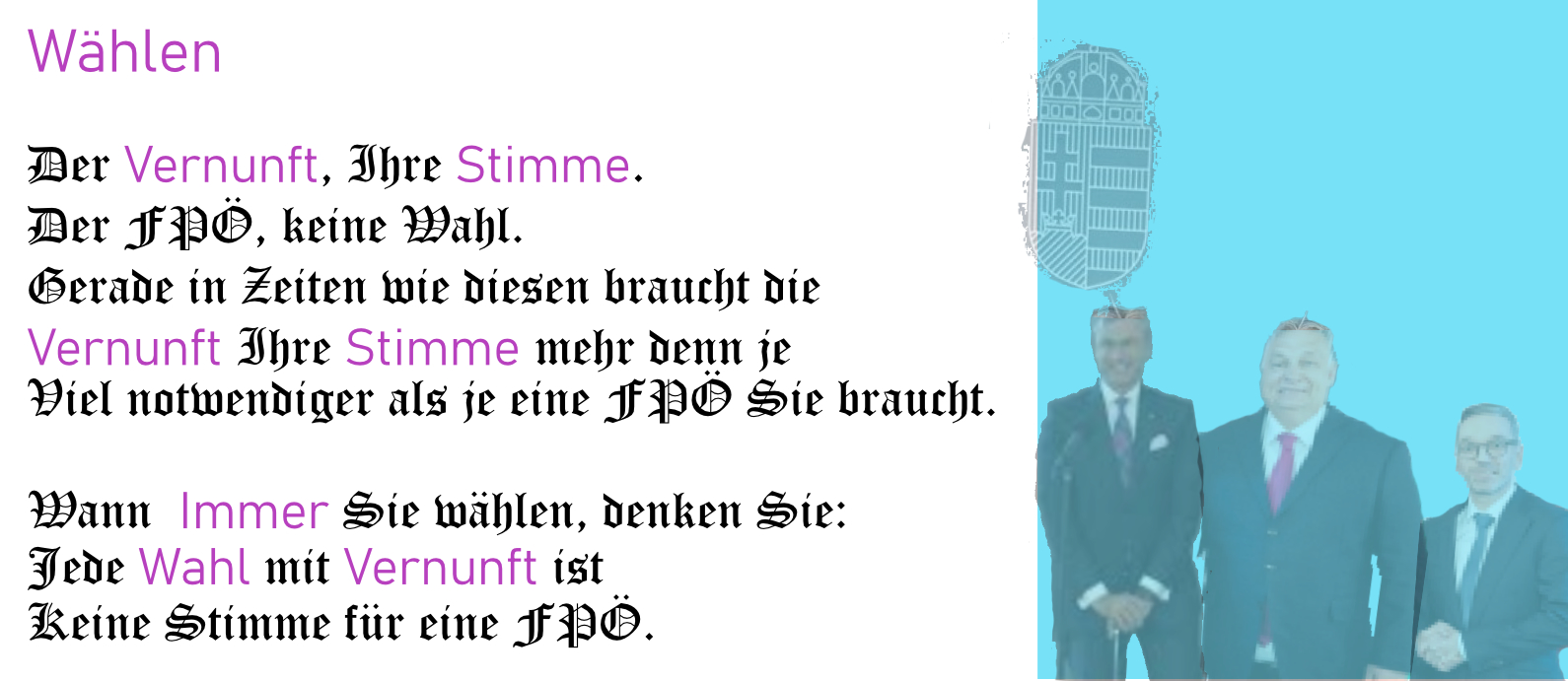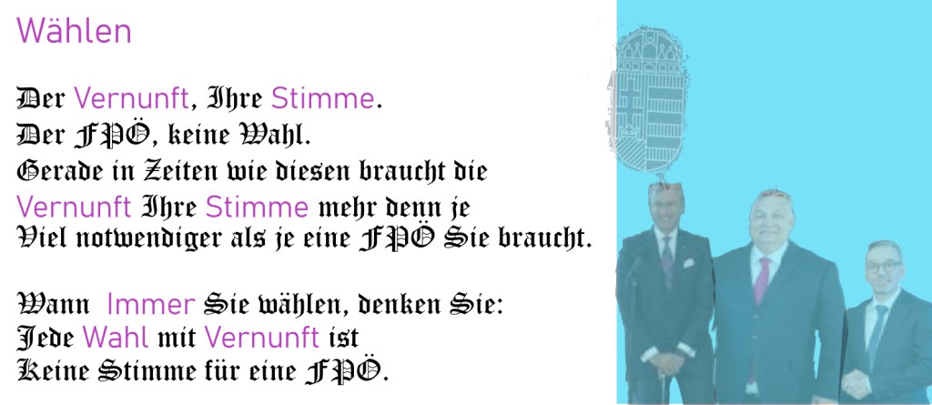 Vielleicht hat beispielsweise ein Martin Sellner in dieser Zeit sein Studium absolviert, als Lehrbücher reichten ihm dafür wohl die Plakate der Partei, deren „Begriffe“ so viele übernehmen, ein Studium, das ausreichte, um in der Hofburg zu tanzen.