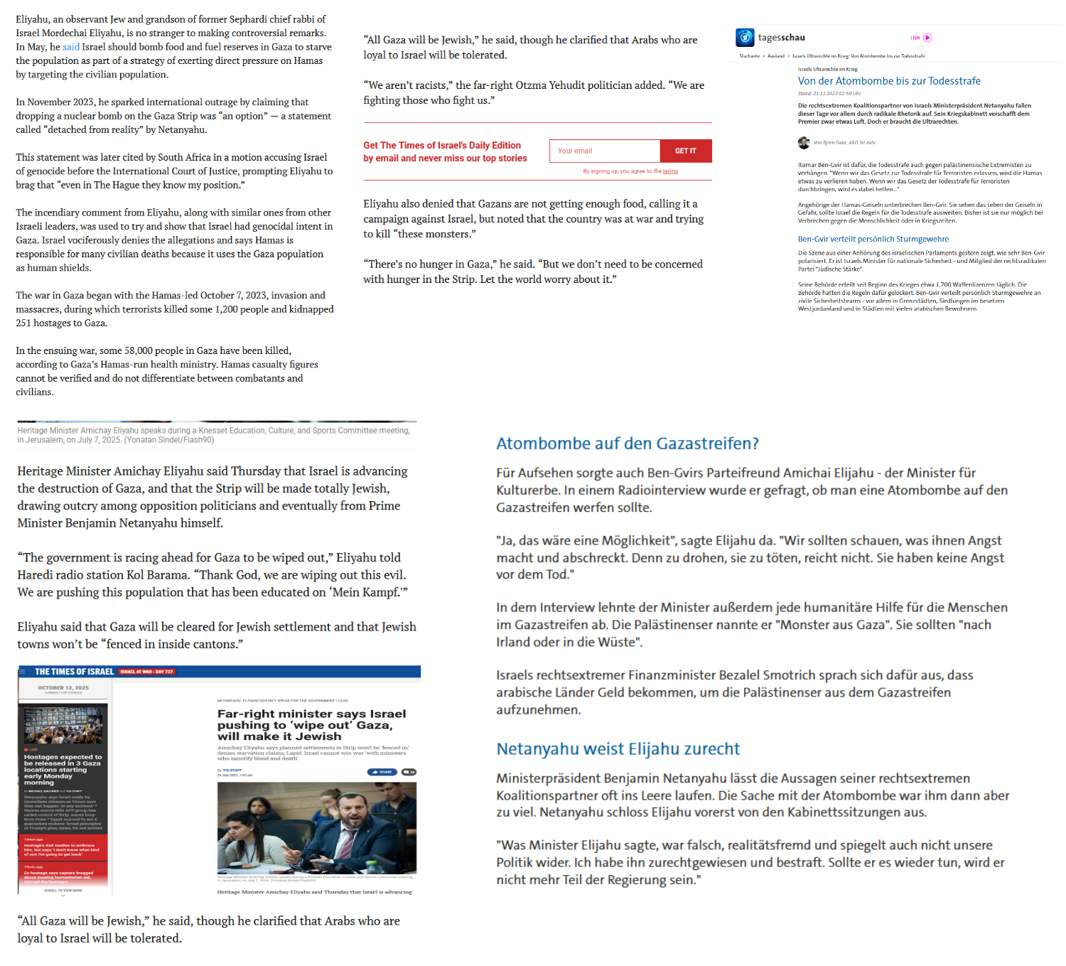 Für Aufsehen sorgte auch Ben-Gvirs Parteifreund Amichai Elijahu – der Minister für Kulturerbe. In einem Radiointerview wurde er gefragt, ob man eine Atombombe auf den Gazastreifen werfen sollte. „Ja, das wäre eine Möglichkeit“, sagte Elijahu da. „Wir sollten schauen, was ihnen Angst macht und abschreckt. Denn zu drohen, sie zu töten, reicht nicht. Sie haben keine Angst vor dem Tod.“ In dem Interview lehnte der Minister außerdem jede humanitäre Hilfe für die Menschen im Gazastreifen ab. Die Palästinenser nannte er „Monster aus Gaza“. Sie sollten „nach Irland oder in die Wüste“.