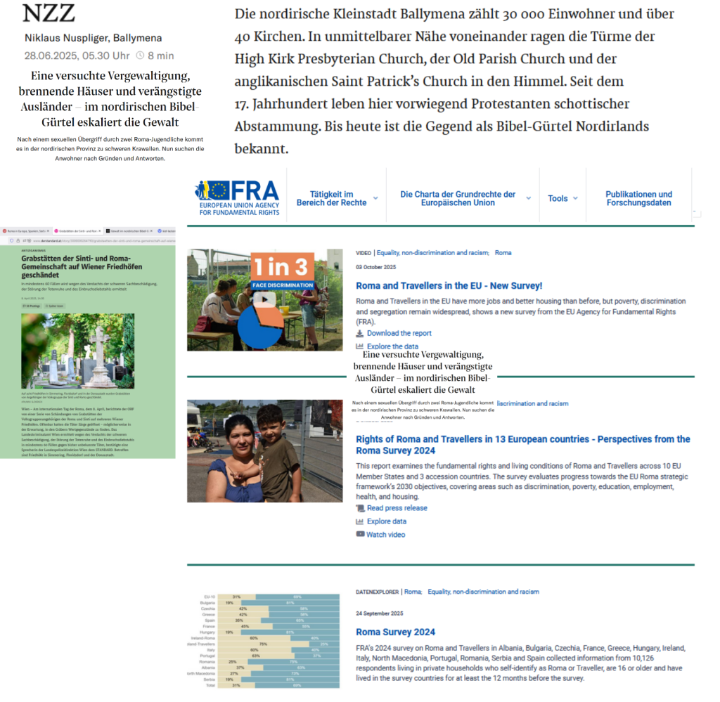 Und auch in diesem Jahr [2025] ist es immer wieder zu Gewalt gegen Roma gekommen. So wurden zum Beispiel im Frühjahr 200 Menschen in der bulgarischen Hauptstadt Sofia obdachlos, nachdem ihre Wohnungen auf Anordnung der lokalen Behörden zerstört wurden. Und in der nordirischen Stadt Bellymena [„Bibel-Gürtel“] hat im Juni ein rassistischer Mob tage- und nächtelang randaliert, nachdem zwei Jugendlichen, laut Medienberichten Roma aus Rumänien, eines sexuellen Übergriffs beschuldigt wurden. Die Gewalt richtete sich vor allem gegen die Roma-Community, andere ethnische Minderheiten und Immigranten. Autos und Wohnhäuser und Geschäftslokale wurden in Brand gesetzt und zerstört. Um nicht selbst Opfer der Gewalt zu werden, brachten Einwohner der Stadt Bellymena Schilder mit der Aufschrift „Hier leben Einheimische“ auf ihren Türen an. Rund 60 Polizeibeamte wurden bei den Randalen verletzt und 53 Personen festgenommen. Eintausendzweihundert Roma und Romnja hatten vor den Unruhen in Bellymena gelebt, laut der BBC und anderen britischen Medien haben mittlerweile fast Zweidrittel von ihnen die Stadt verlassen.