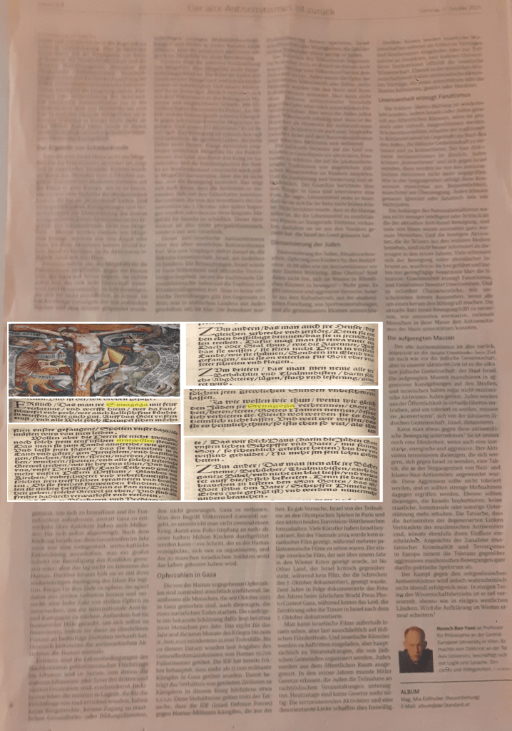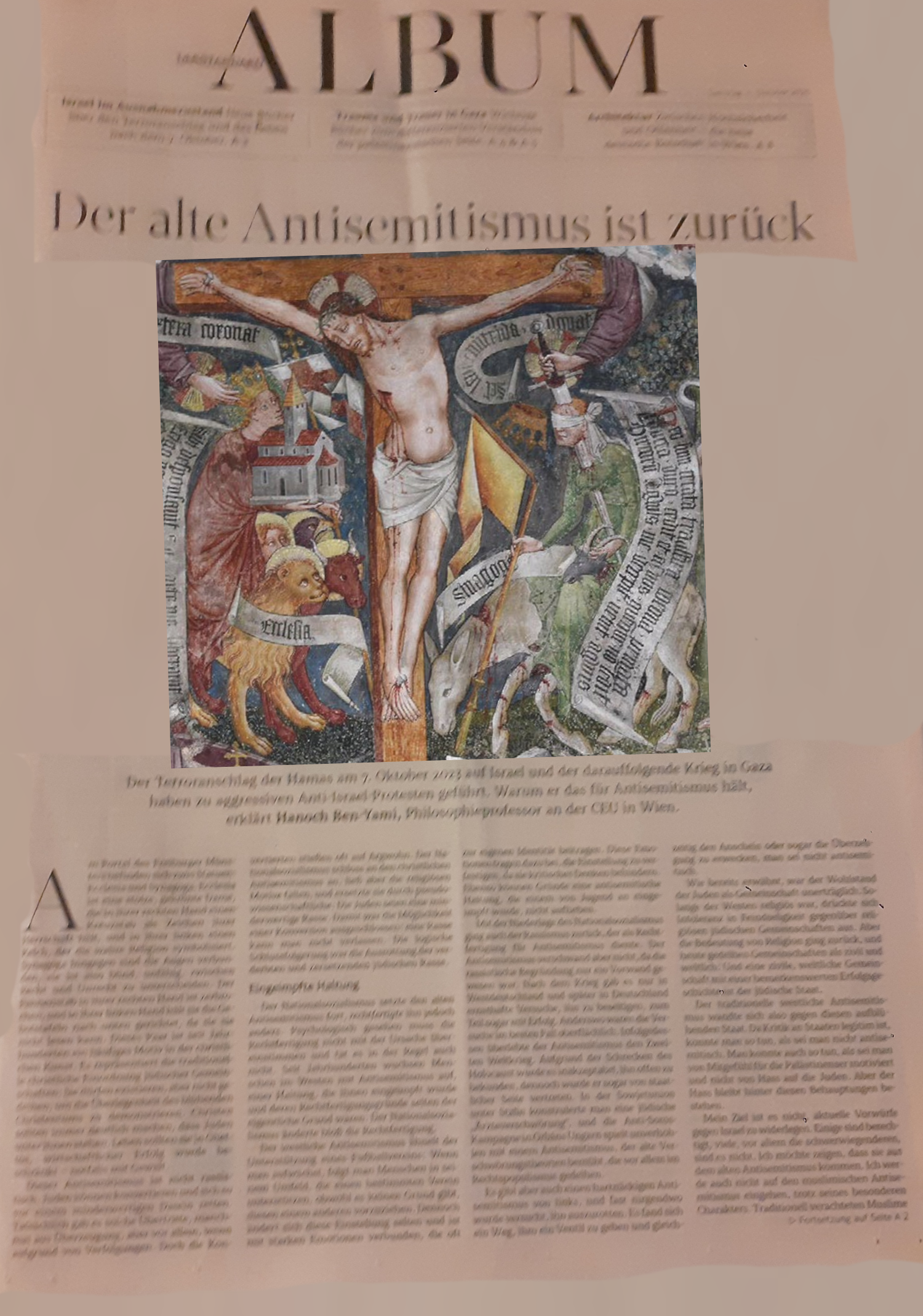 Am Portal des Freiburger Münsters befinden sich zwei Statuen: Ecclesia und Synagoga. Ecclesia ist eine stolze, gekrönte Dame, die in ihrer rechten Hand einen Kreuzstab als Zeichen ihrer Herrschaft hält, und in ihrer linken einen Kelch, der die wahre Religion symbolisiert. Synagoga hingegen sind die Augen verbunden, sie ist also blind, unfähig, zwischen Recht und Unrecht zu unterscheiden. Der Fahnenstab in ihrer rechten Hand ist zerbrochen, und in ihrer linken Hand hält sie die Gebotstafeln nach unten gerichtet, da sie sie nicht lesen kann. Dieses Paar ist seit Jahrhunderten ein häufiges Motiv in der christlichen Kunst. Es repräsentiert die traditionelle christliche Einordnung jüdischer Gemeinschaften: Sie dürfen existieren, aber nicht gedeihen, um die Überlegenheit des blühenden Christentums zu demonstrieren. Christen sollten immer deutlich machen, dass Juden unter ihnen stehen. Leben sollen sie in Ghettos, wirtschaftlicher Erfolg wurde beschränkt — notfalls mit Gewalt.