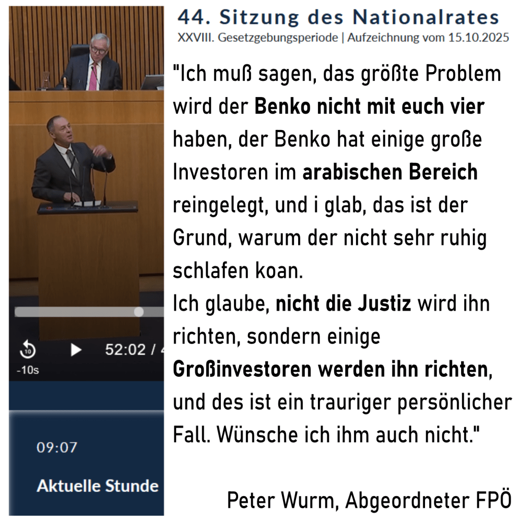 Diese Aussage von Peter Wurm am heutigen Vormittag, 15. Oktober 2025, im österreichischen Parlament unter der Sitzungsführung von Walter Rosenkranz forderte keine Widerrufe von Abgeordneten heraus, führte zu keinem Ordnungsruf durch den Nationalratspräsidenten, die Rede des Peter Wurm, die er unmittelbar an das Gesagte, die Justiz werde Benko nicht richten, sondern einige Großinvestoren aus dem arabischen Berich werden ihn richten, schloß mit