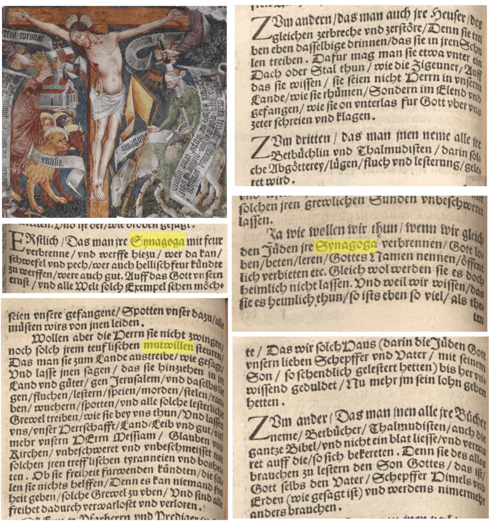 Das man jre Synagoga mit feur verbrenne / Und werffe hie zu, wer da kan / schwefel und pech, Wer auch hellisch feur kuendte zu werffen, were auch gut. Auff das Gott unsern ernst / und alle Welt solch Exempel sehen moechte, das wir solch haus (darin die Jueden Gott, unsern lieben Schepffer und Vater / mit seinem Son / so schendlich gelestert hetten) bis her unwissend geduldet, Nu mehr jm sein lohn geben hetten.