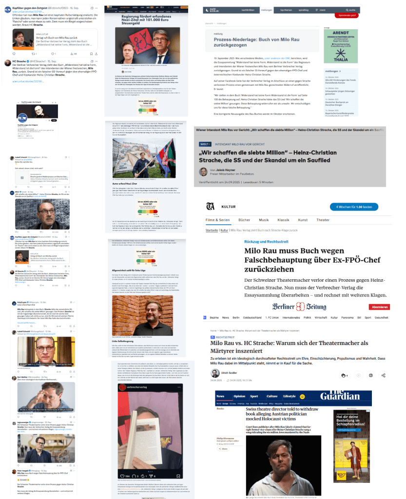 WIDERRUF Wir stellen in dem Buch „Widerstand hat keine Form Widerstand ist die Form“ auf Seite 100 die Behauptung auf, Heinz-Christian Strache hätte das SS-Lied „Wir schaffen die siebte Million“ gesungen. Diese Behauptung widerrufen wir als unwahr. Wir entschuldigen uns für diese falsche Behauptung. Berlin, den 12.9.2025 Wien, den 12.9.2025 Kristine Listau und Jörg Sundermeier Milo Rau Verbrecher Verlag GmbH Das Buch ist aus dem Handel zurückgezogen.