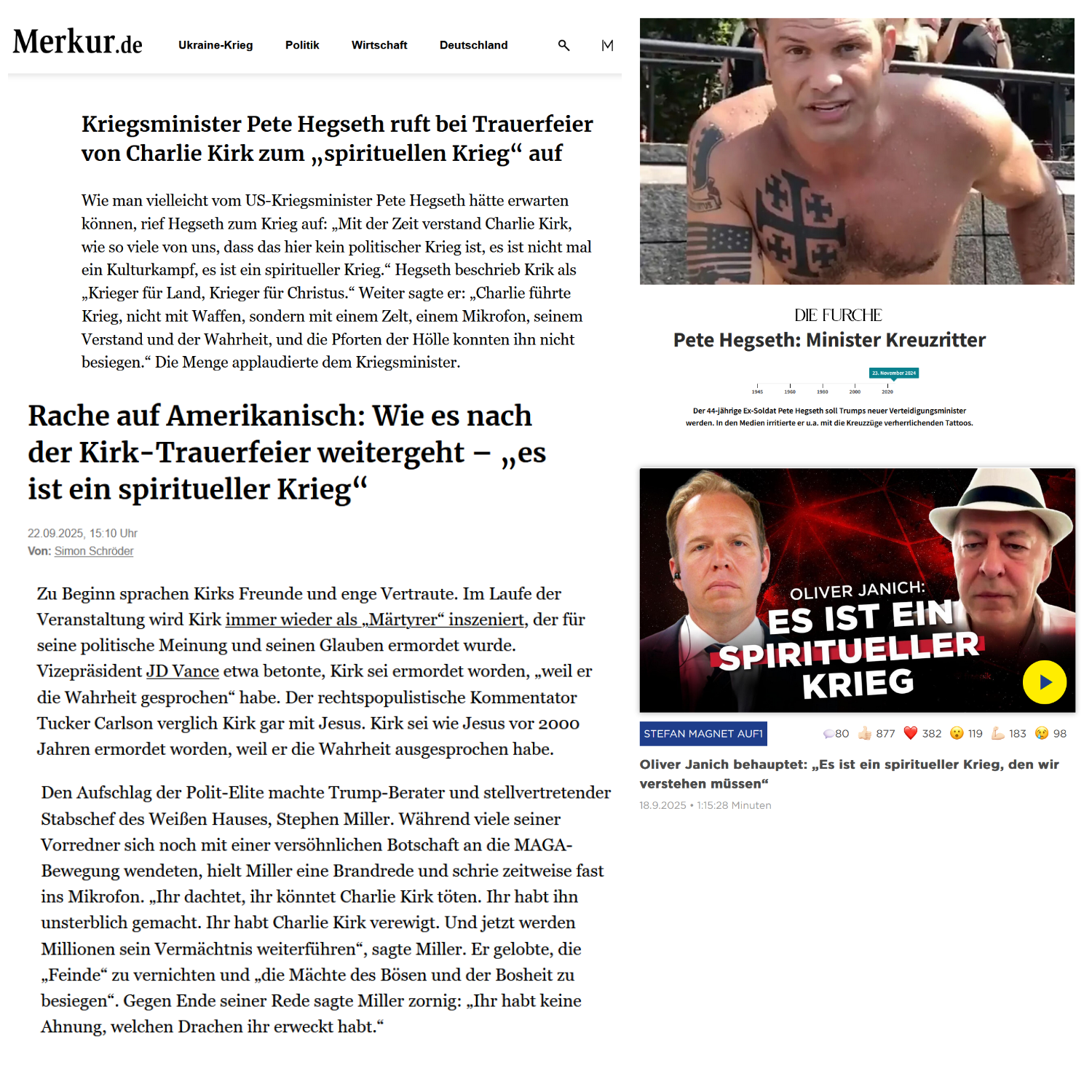 Es wird Oliver Janich, daß der zurzeitige Minister in dem trumpig dominierten Vereinigten Land ebenfalls von einem „spirituellen Krieg“ spricht, wie eben in seinem Wort zum verwichenen Sonntag, Gefallen und Beweis seiner Weise sein, aber muß es einem Minister nicht seltsam zumuten, geistig nicht über Janichsches hinauszukommen? Diesem Minister, Peter Hegseth,