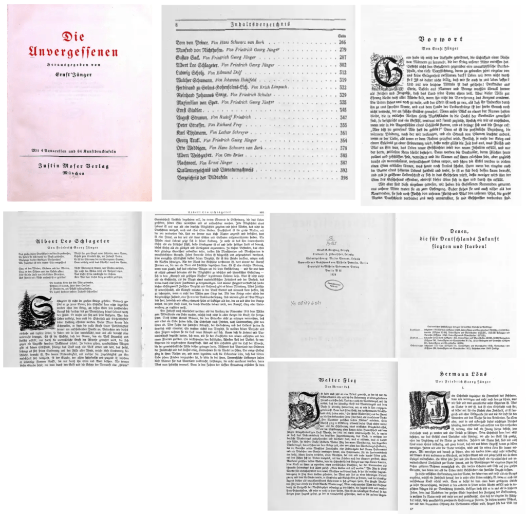 Es wird sich Heidegger wohl recht auf die Gedächtnisrede vorbereitet haben, vielleicht auch in „Die Unvergessenen“ nachgeblättert haben, die 1928 erschienen sind, deren Herausgeber Ernst Jünger versammelte in diesem Gedächtnisbuch zur Widmung: „Denen, die für Deutschlands Zukunft siegten und starben!“ Sein Bruder, Friedrich Georg Jünger, schrieb darin das Lob auf Albert Leo Schlageter, „Mitglied der NSDAP-Tarnorganisation Großdeutsche Arbeiterpartei“, der jedoch nicht im Krieg von 1914 bis 1918 getötet wurde, sondern aufgrund „Spionage“ und „Sprengstoffanschläge“ zum „Tode verurteilt“ wurde … Dennoch behauptet Ernst Jünger in seinem Vorwort: