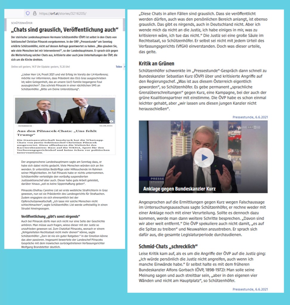 Nach der Sicht dieses Landeshauptmannes müßte es wohl ebenso grauslich sein, die Chats der Männer und Frauen der Verschwörungen zu veröffentlichen. Für die Veröffentlichung dieser Chats aber würden dem Landeshauptmann mit Bestimmtheit Argumente einfallen, warum das Veröffentlichen dieser Chatsnicht grauslich …