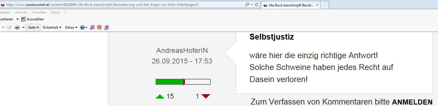 Gesinnungsgemäß schreibt FPÖ unzensuriert keinen freundlichen Kommentar zu Ute Bock. Das Bekannte eben. Das ist nebensächlich. Und daß es wüste und abscheuliche Kommentare der Schreibstaffel sofort zu diesem Kommentar der FPÖ unzensuriert gibt – ebenfalls das Bekannte …