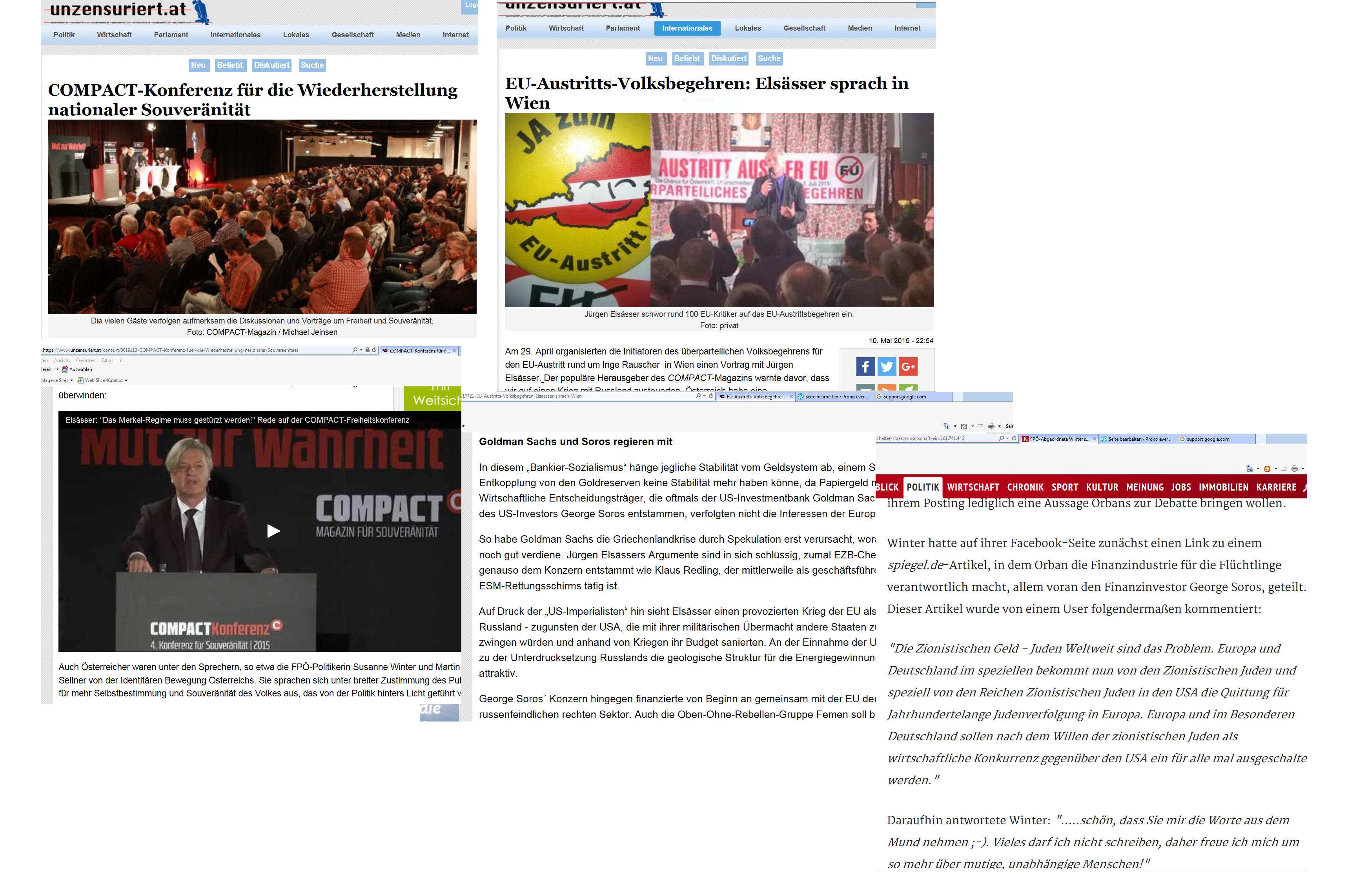 Wenn Sie sich erinnern, die Verabschiedung der Susanne Winter aus der FPÖ hatte auch etwas mit George Soros zu tun. Ein Mann, wie in der zweiten Collage oben gelesen werden kann, der mit keinen guten Worten auf der FPÖ unzensuriert beispielsweise bedacht wird. Für FPÖ unzensuriert ist Jürgen Elsässer ein „populärer Herausgeber“. Für He.-Chr. Strache gehört er, wie in der obigen Collage gelesen werden kann“ zu den „prominenten EU-Kritikern. Das sind also „Informationen“, die der zurzeitige Obmann der FPÖ empfiehlt …