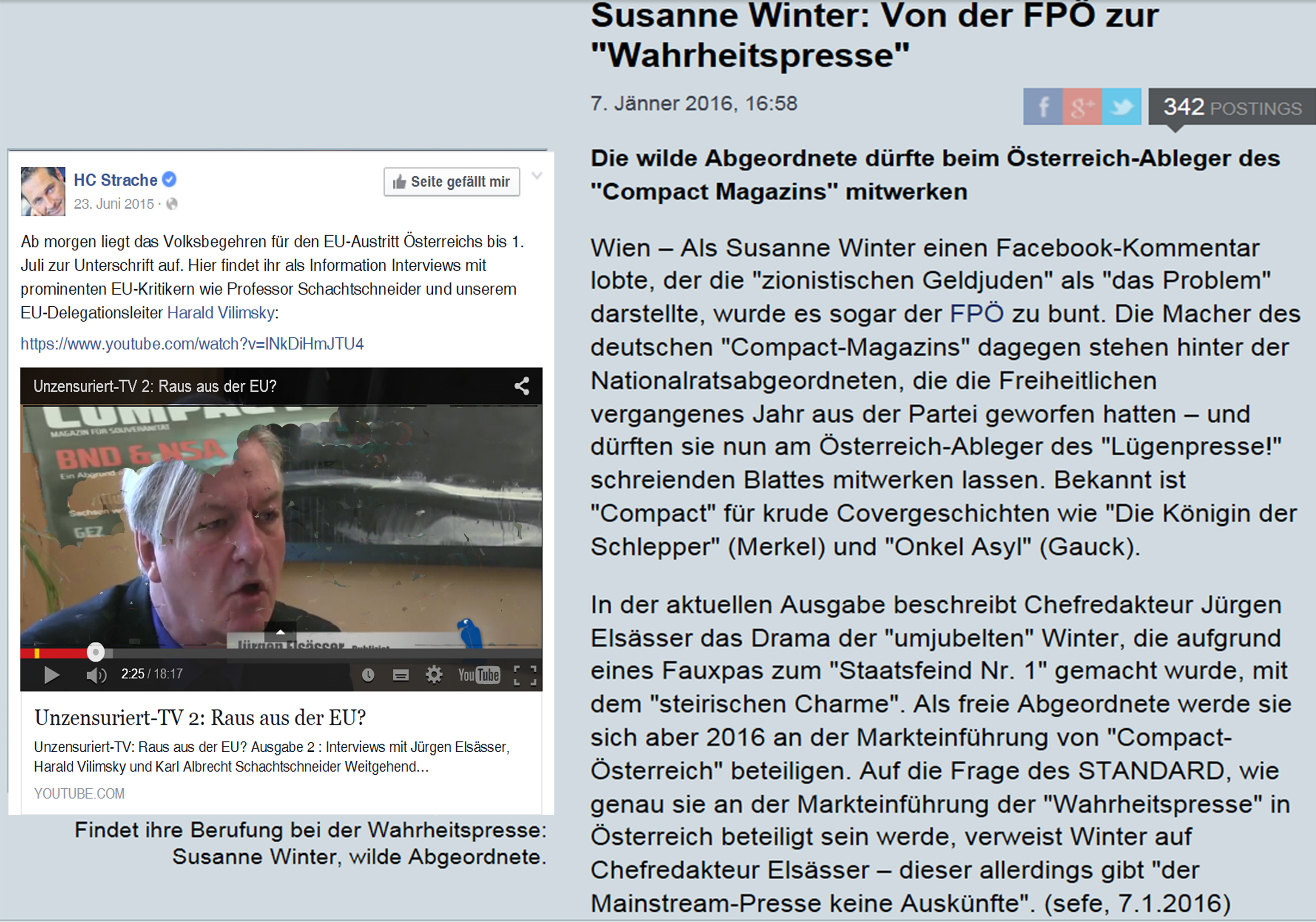 Was die sogenannte Qualitätszeitung „Der Standard“ allerdings nicht berichtet, ist zum Beispiel, daß es kein Zufall ist, wenn Susanne Winter jetzt bei diesen „Machern“ landet; sie war beispielsweise noch als FPÖ-Mandatarin Sprecherin auf der Compact-Konferenz im Oktober 2015, wie übrigens auch Martin Sellner von den außerparlamentarischen Identitären …