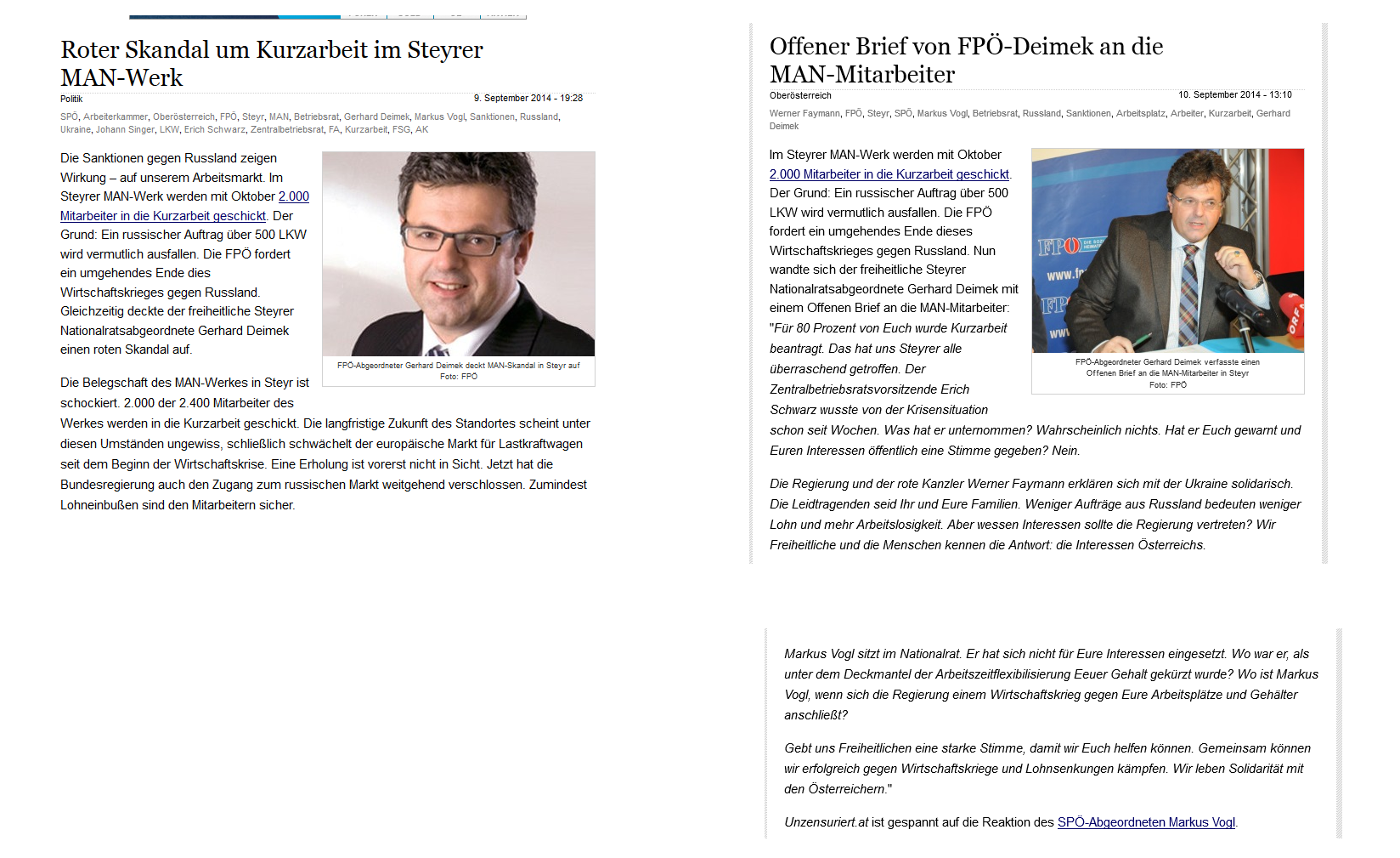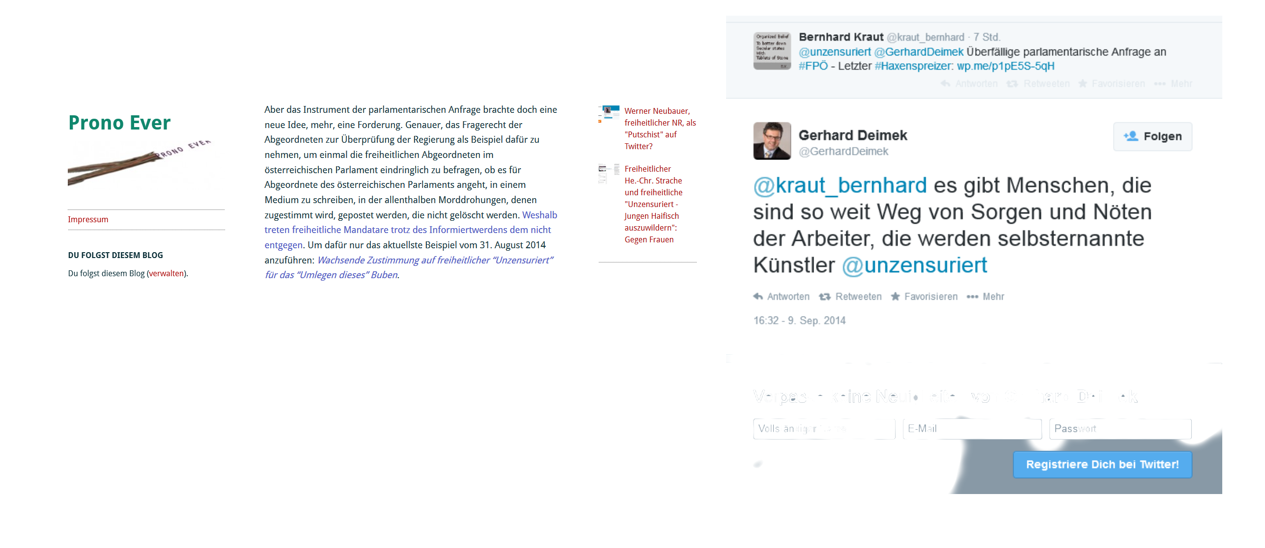 Und dann wären noch die Kommentare der von einem NR der FPÖ geführten „Zur Zeit“, die ebenfalls Gegenstand für Entschließungsanträge, für parlamentarische Anfragen … Aber auch diese kann die identitäre Gemein-Schaft nicht stellen, es wären ebenfalls welche, die … Auch hier, unmöglich eine vollständige Liste zu erstellen, deshalb ebenfalls bloß ein paar Beispiele aus der letzten Zeit: