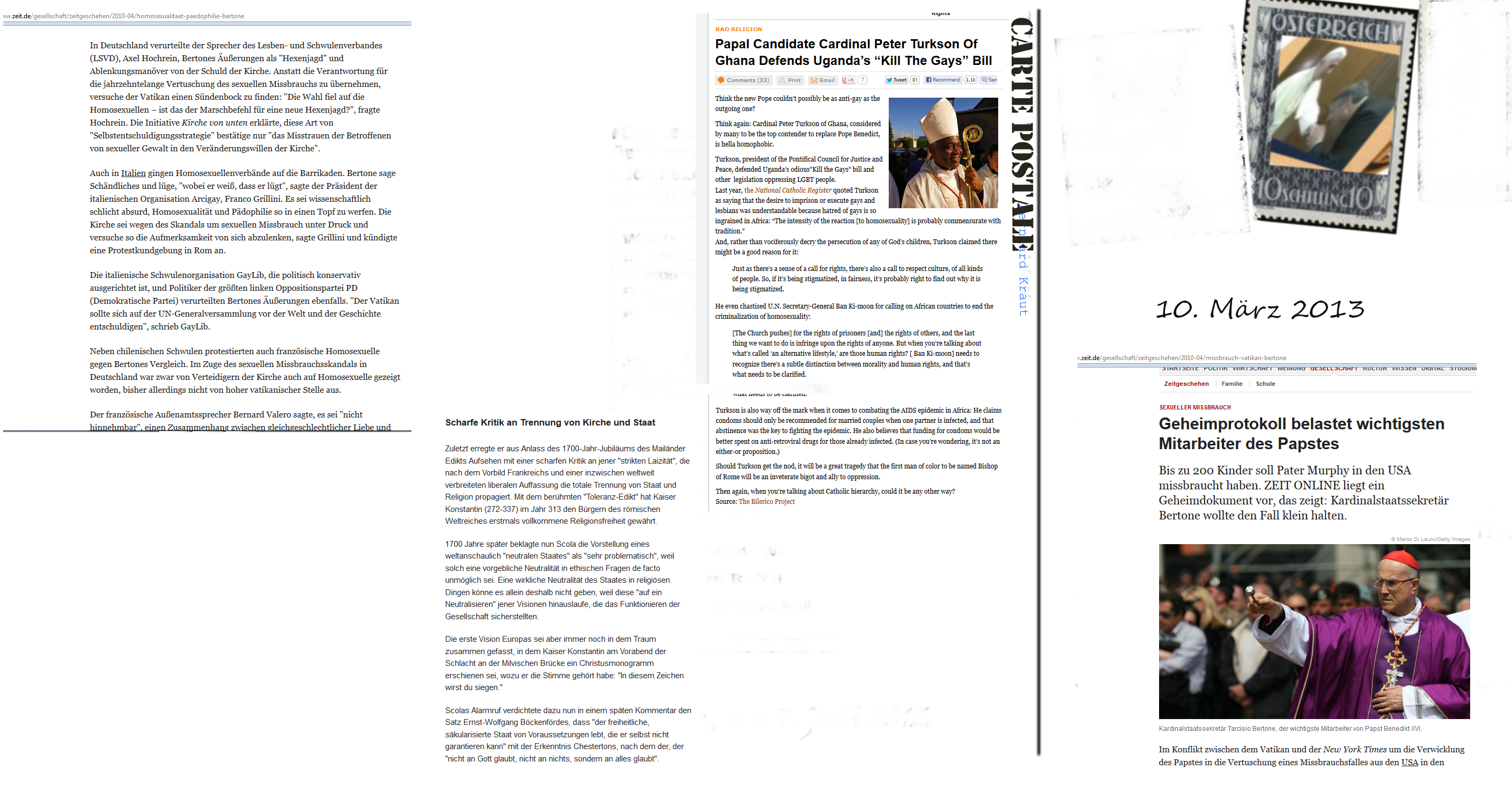Vielleicht wird der Staat in einem Grätzel von Rom in einer Woche oder in zwei Wochen einen sogenannten gemäßigten Herrscher haben, aber auch dieser wird ein absolutistisch Regierender sein, vielleicht wird es einer von den derzeit buchmacherisch Hochfavorisierten sein, zu dem dann Abertausende aus demokratischen Ländern reisen werden, um ihn zu bejubeln, vielleicht wird es Peter Turkson sein, und wie werden sich die Menschen, gegen die Peter Turkson wettert, fühlen, wenn sie sehen werden müssen, daß diesem Peter Turkson Abertausende als ihren neuen Papst feiern, ihn als ihren neuen spirituellen Führer begrüßen und für ihn beten, ihn segnen, einen Verteidiger von Gefängnis und Todesstrafe für Menschen, die nichts verbrochen haben, die nur eines haben, was auch die Abertausenden naturgegeben haben, was also auch Peter Turkson, für ihn nach seiner Welterklärung formuliert, gottgegeben hat, eine sexuelle Orientierung –, jedwede Strafe aber gegen sexuelle Orientierung ist Unrecht, die Todesstrafe gegen sexuelle Orientierung ist mehr noch, es ist Mord, Verbrechen gegen die Menschlichkeit.