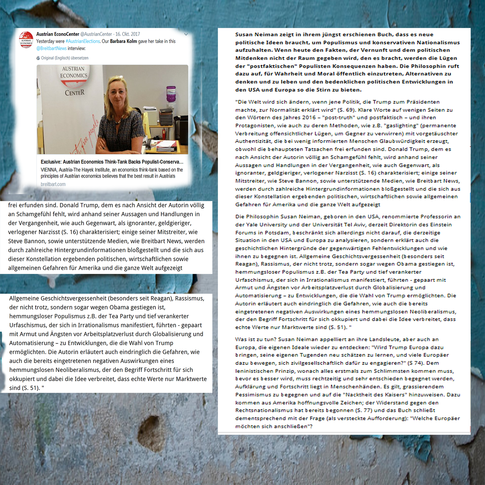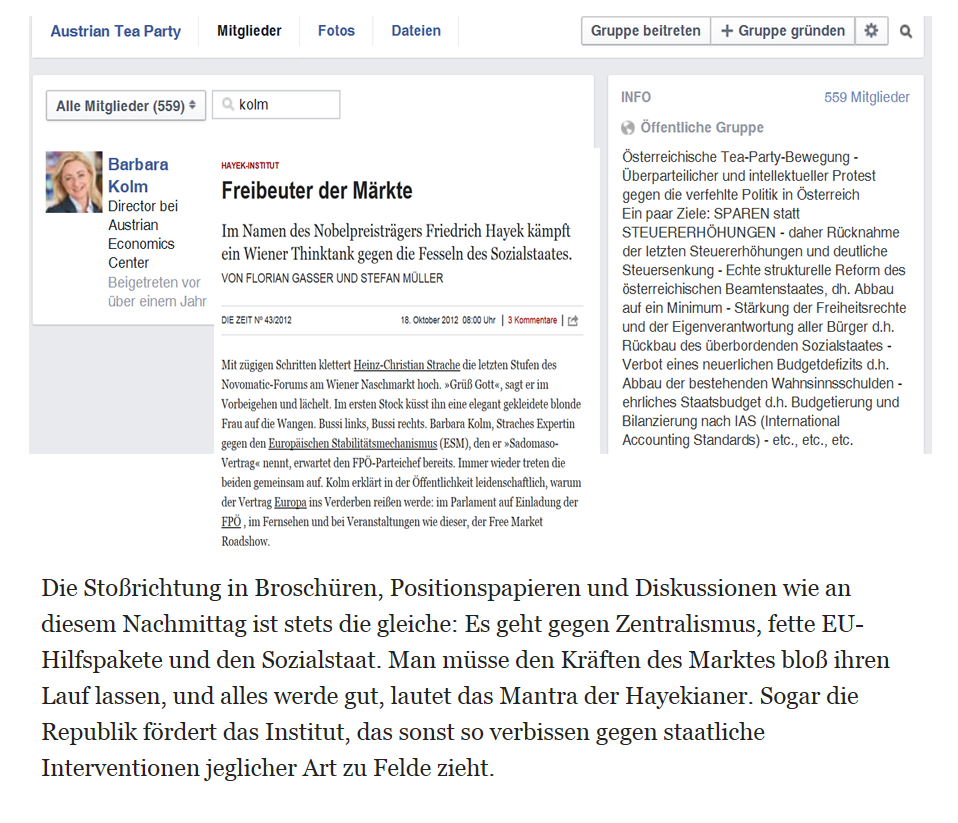 „Rückbau des „überbordenden Sozialstaates“ … Das hat das mit Steuergeld geförderte Hayek-Institut, deren Präsidentin Kolm ist, eindrucksvoll bereits umgesetzt – staatliche Förderungen für Institute ihres Schlages sind keine sozialstaatlichen Leistungen …