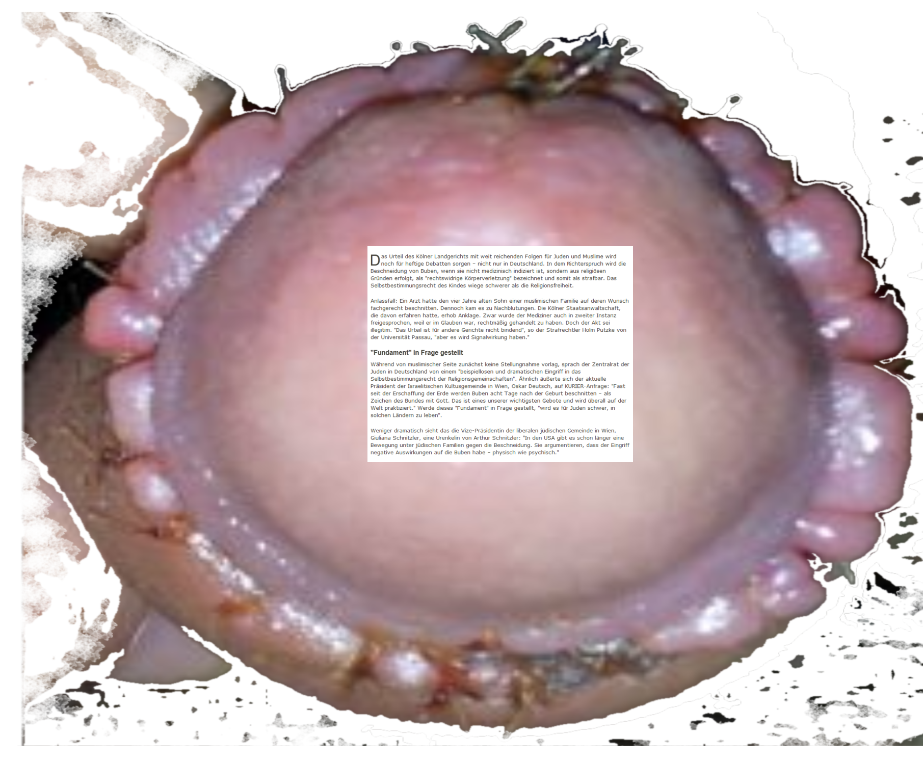 Und welche Privilegien gestehen Organisierte Glauben zu -, nach den Freiheiten, die Organisierte Glauben zugestehen, will erst gar nicht gefragt werden. Wie in der Collage gelesen werden, „Ausrottung aus dem Volk“ von jenen, die das Gebot der Beschneidung …