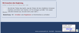 Wenn Menschen sich verbal austoben, etwa auf Websites, die, entgegen den Intentionen ihrer Betreiber und Betreiberinnen, für nichts anderes gut sind, als dafür, daß Menschen sich schriftlich verausgaben, um nicht tatsächlich und wirklich gewalttätig zu werden, ist es hinzunehmen. Wenn das allerdings auf der Website der „Informationen“ des III. Präsidenten NR zugelassen wird, bekommt es eine fragwürdige Qualität. Wie der Screenprint zeigt, bezeichnet Andreas Mölzer „Unzensuriert.AT“ nach wie vor als …, und Andreas Mölzer muß es schließlich wissen, wenn einmal angenommen werden darf, daß er doch etwas …